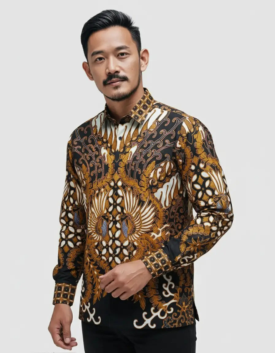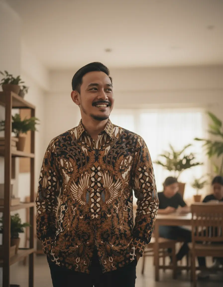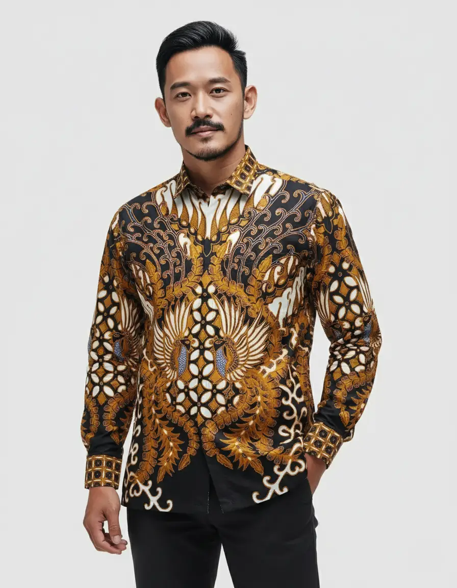 Warna sogan yang hangat kami pilih untuk mewakili kematangan dan kerendahan hati, sementara sentuhan emasnya memancarkan cahaya wibawa. Semua ini kami lukis dengan sabar di atas kain katun primissima yang halus, agar setiap sentuhannya terasa nyaman dan menenangkan di kulit.