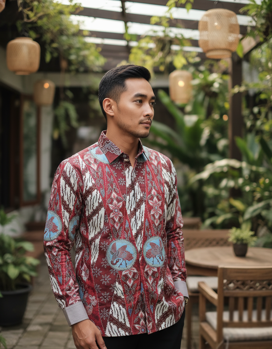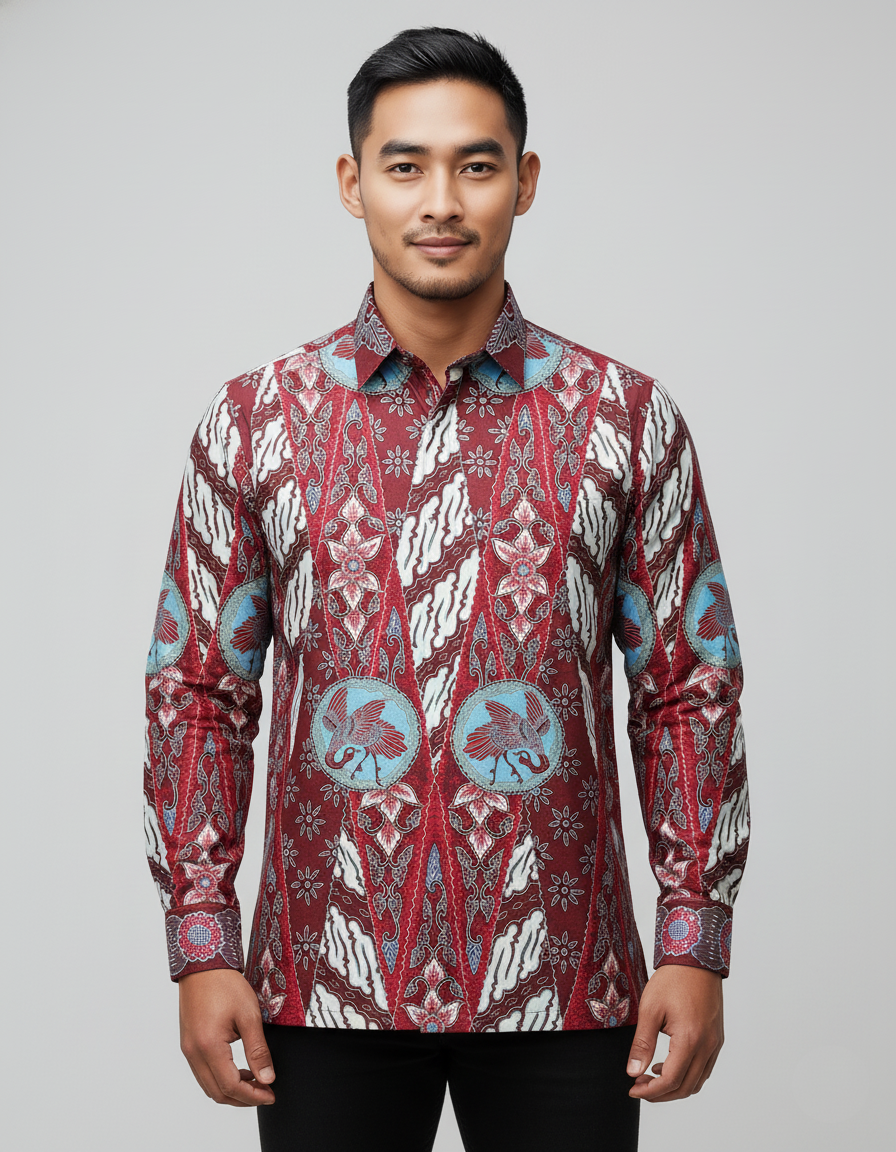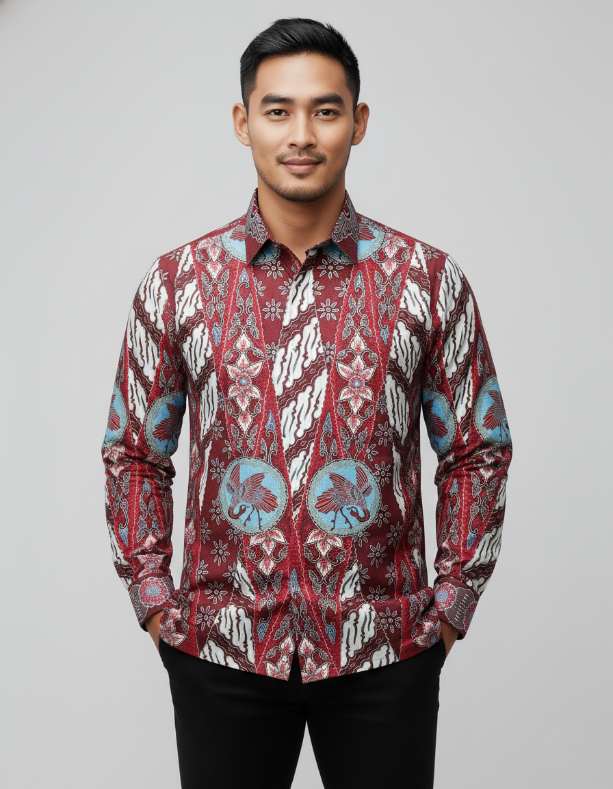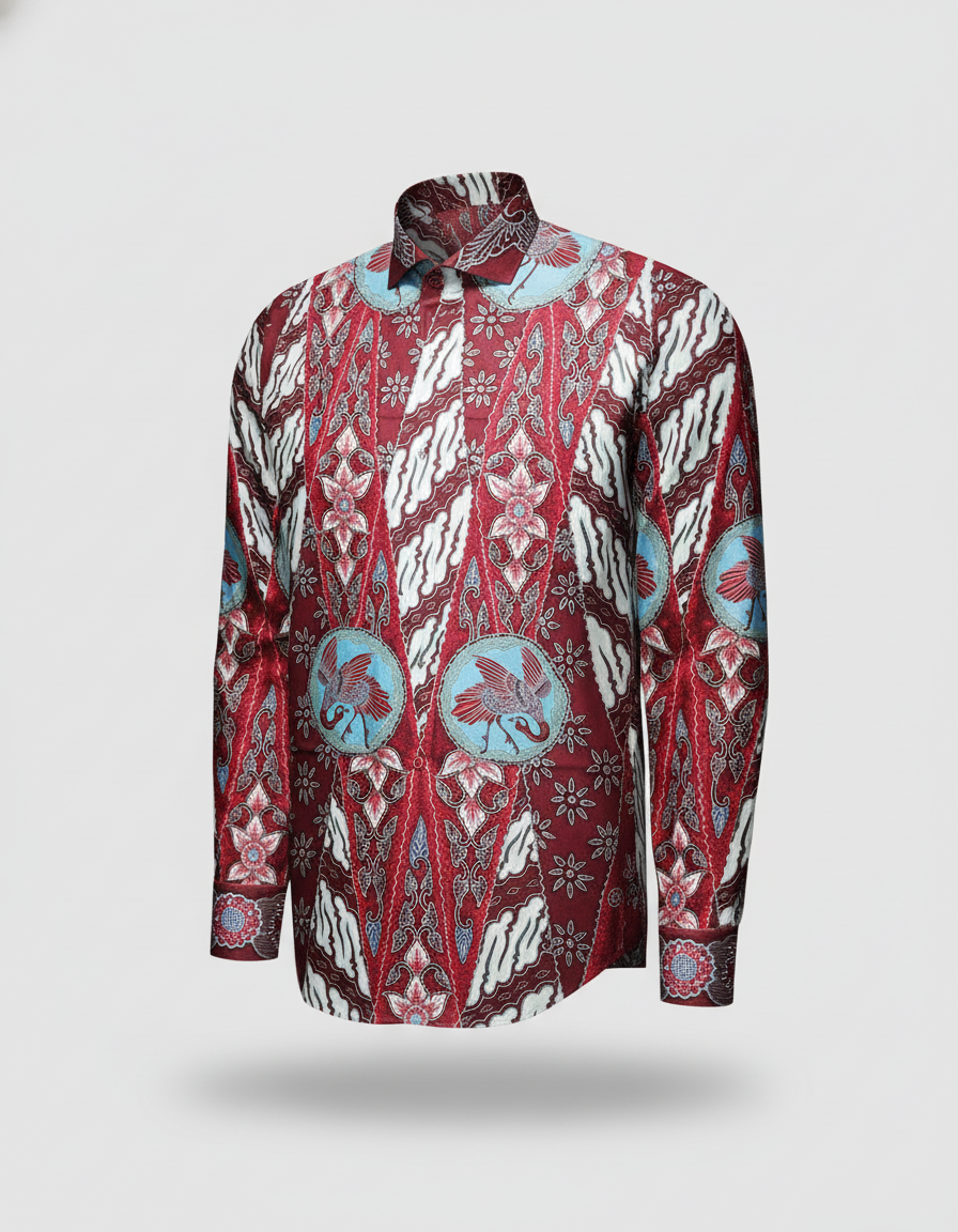 Motif bangau yang anggun menari dalam balutan warna merah saga yang hangat. Sebuah kain yang membawa cerita tentang kesetiaan dan harapan dalam setiap goresannya.