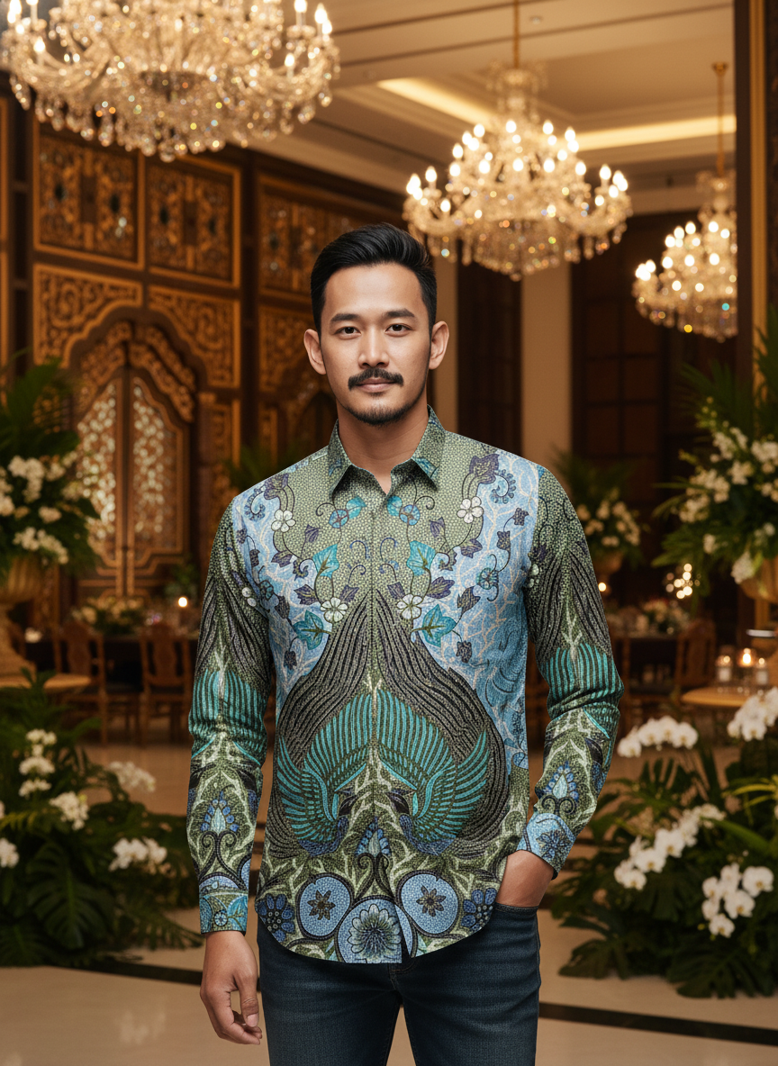 Sepasang Cendrawasih yang anggun terlukis dalam gradasi warna hijau dan biru yang sejuk. Sebuah kain yang kami titipkan untuk membawa ketenangan dan wibawa dalam penampilan Anda.
