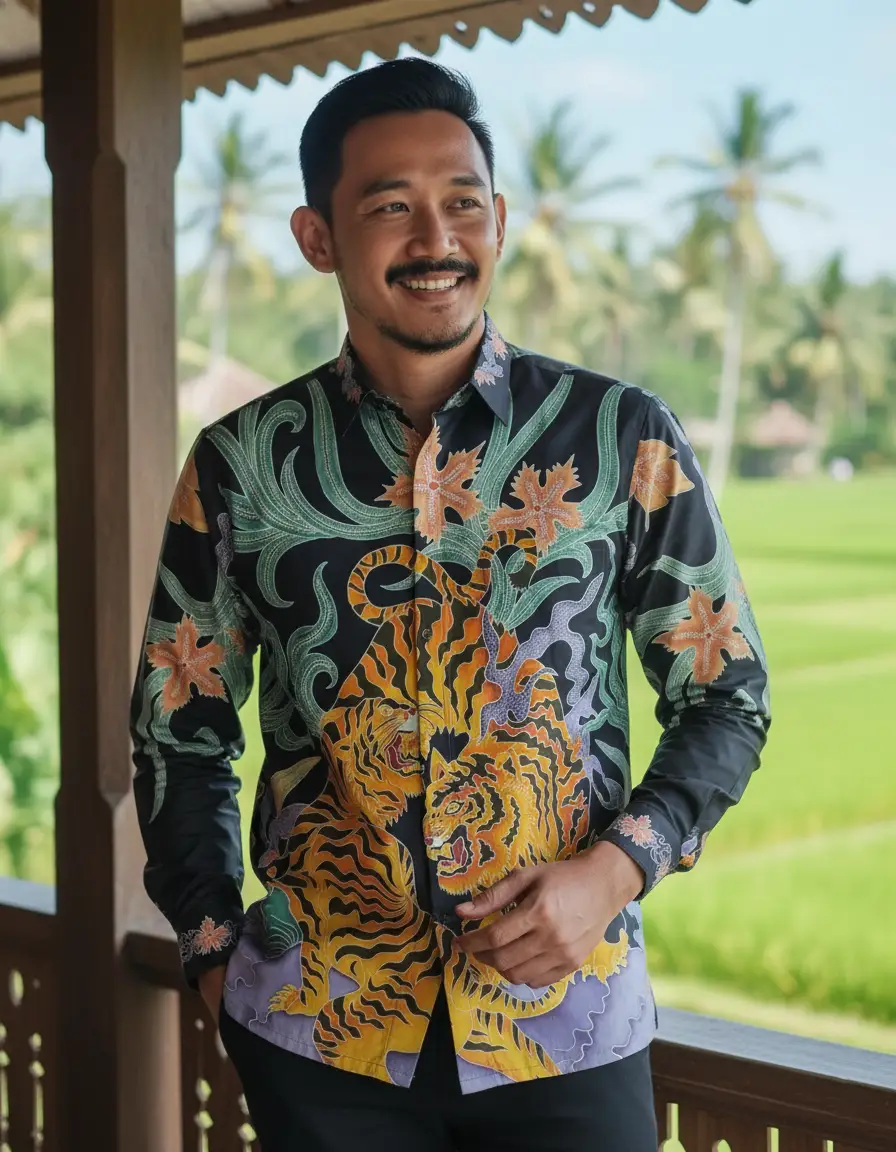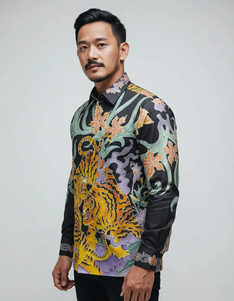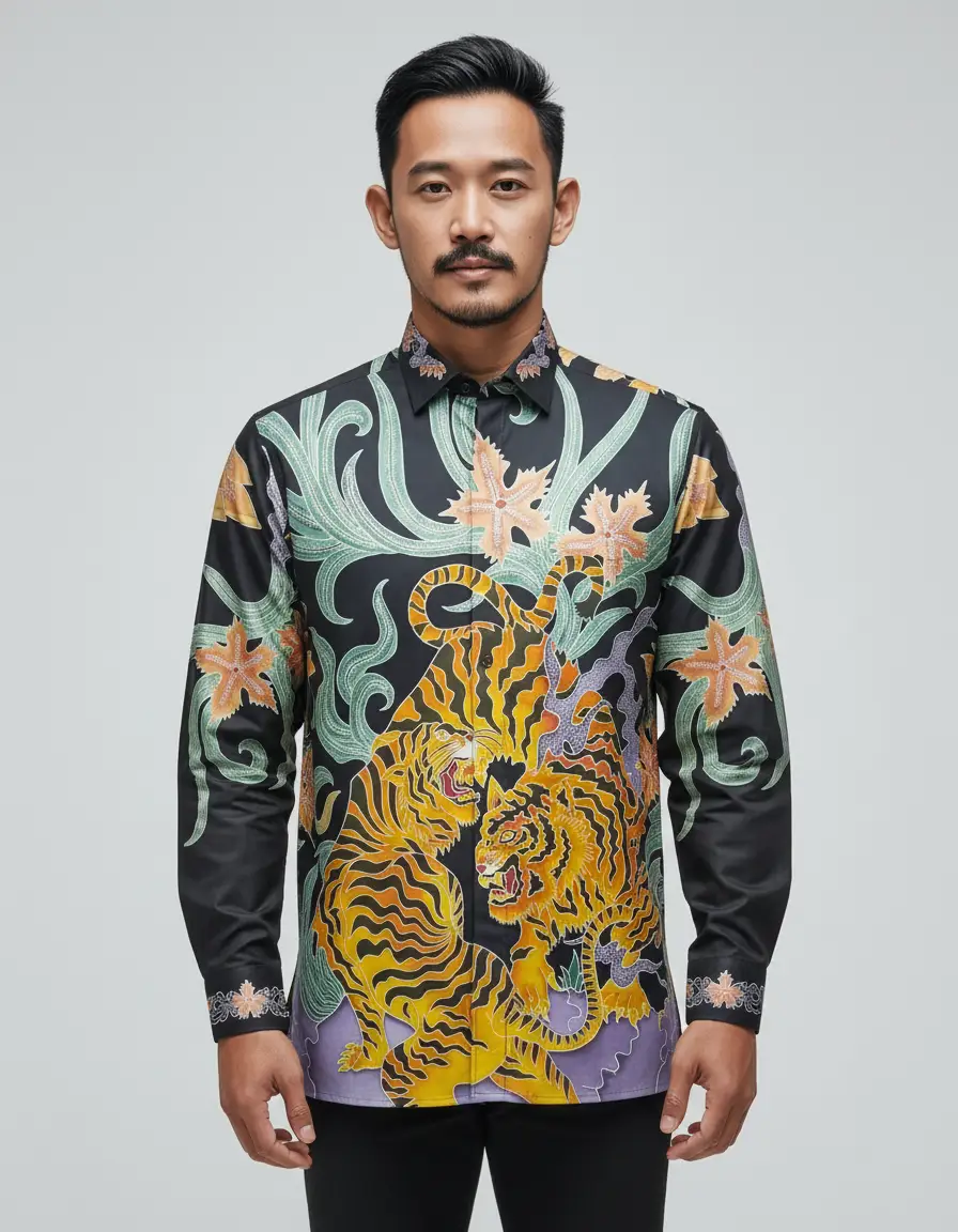 Dikelilingi sulur dan bebungaan, mereka mengingatkan kita bahwa kekuatan sejati selalu tumbuh berdampingan dengan keindahan dan kelembutan. Dilukis di atas kain katun primissima pilihan, teksturnya terasa halus di kulit, adem, dan jatuh dengan anggun saat dikenakan. Warna-warnanya yang tajam di atas dasar hitam pekat memberikan kesan yang tak terlupakan.