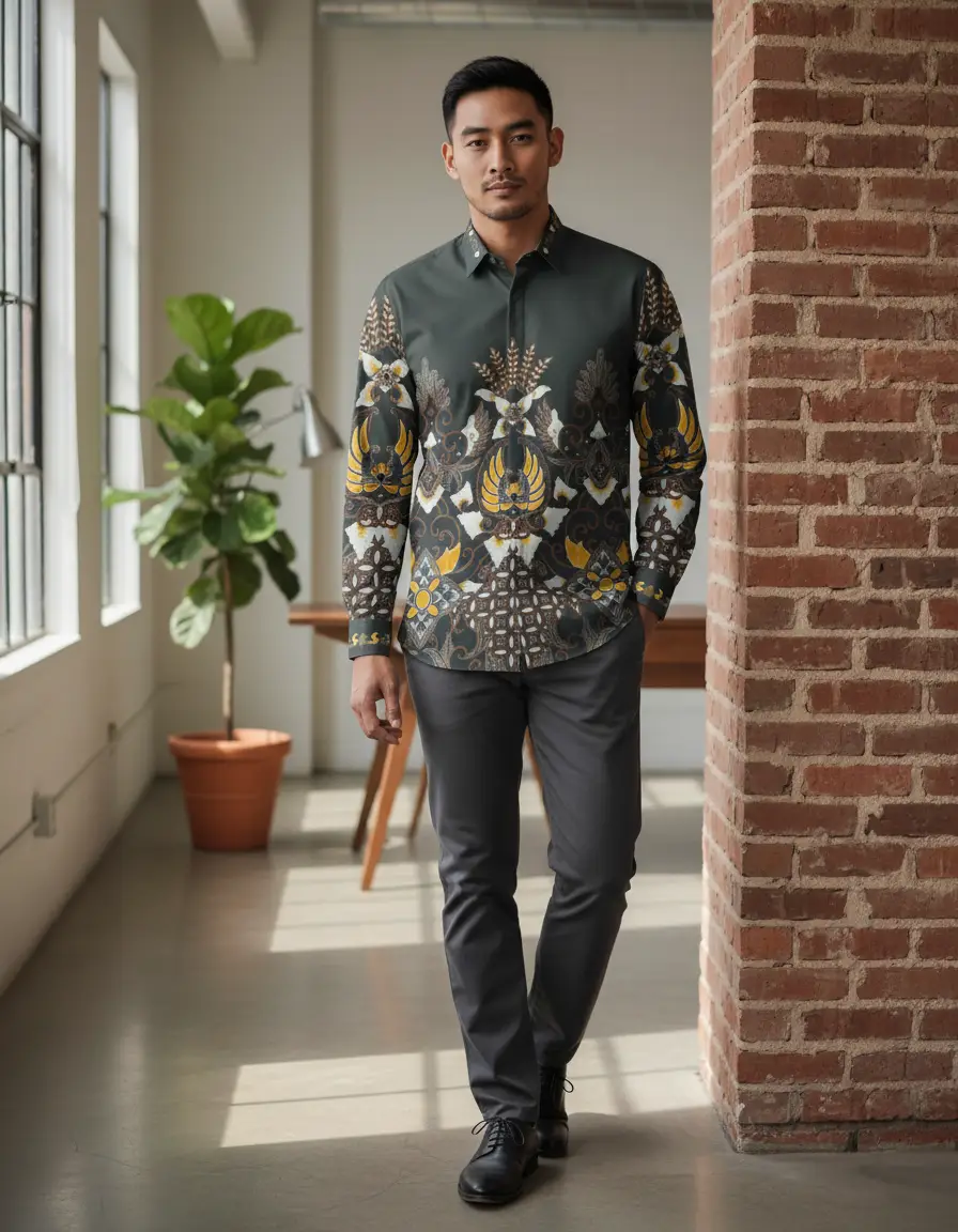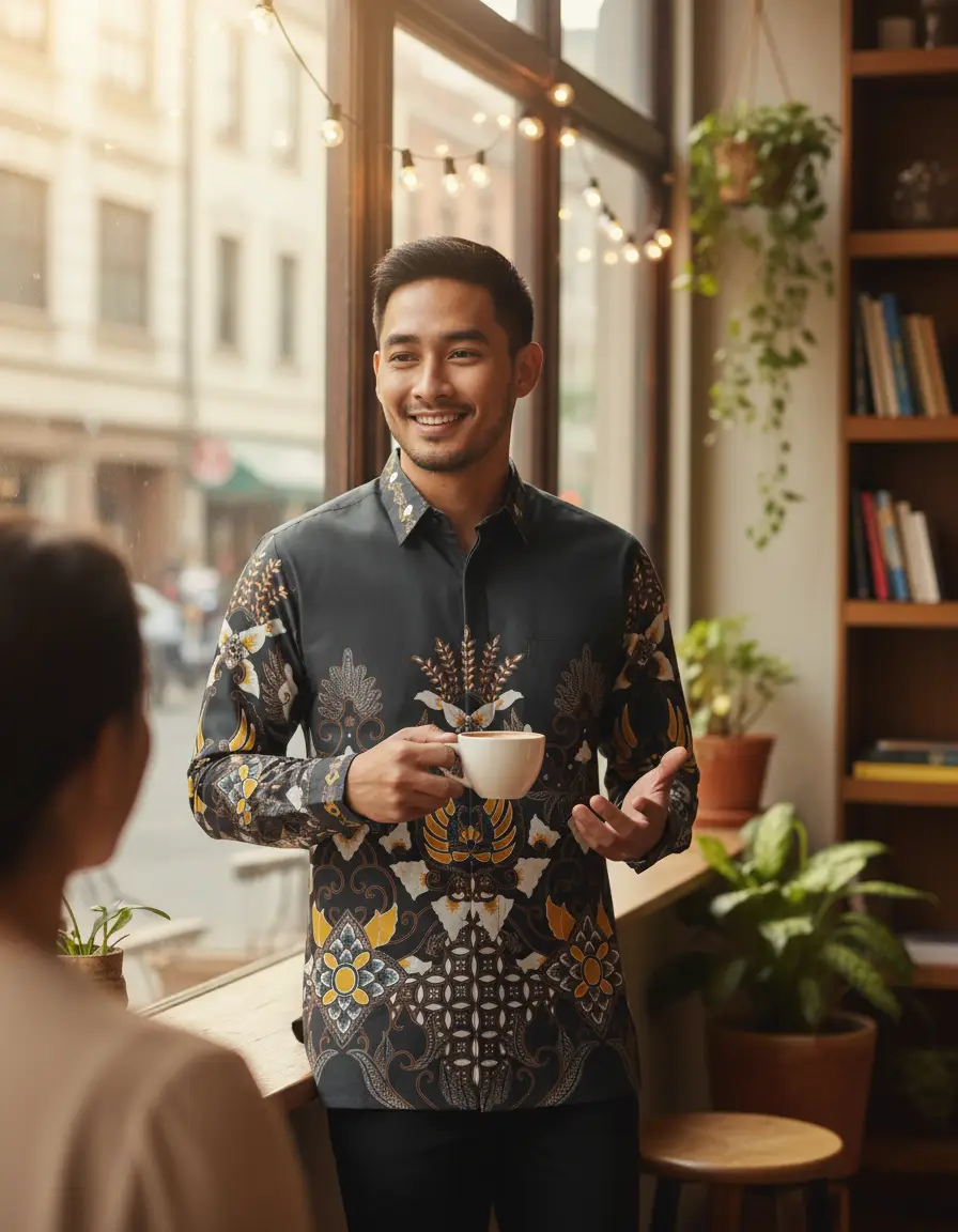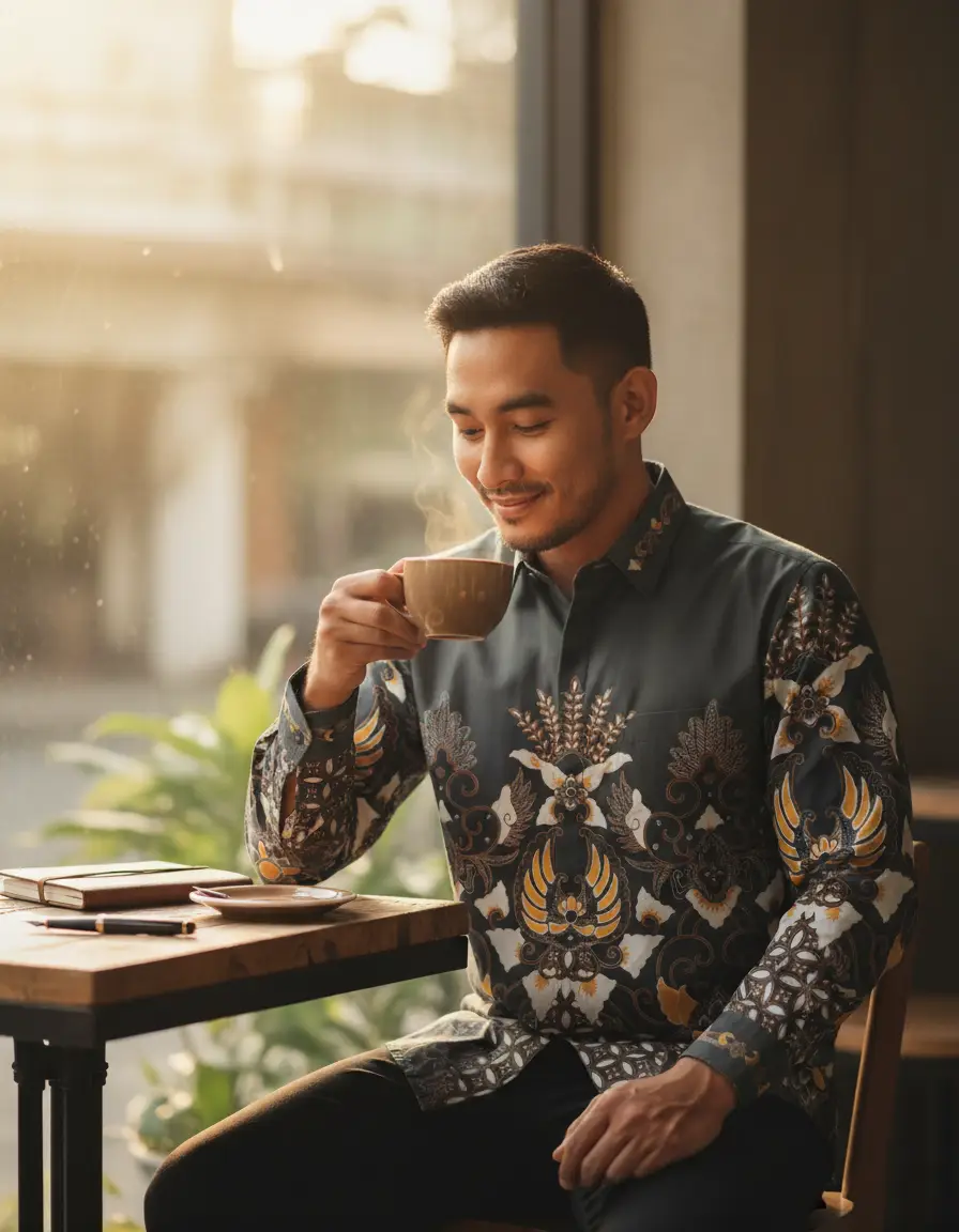Penempatan pola yang unik di bagian bawah dan lengan memberikan ruang bagi ketenangan di bagian dada, menciptakan siluet yang berkelas dan tidak berlebihan. Warna sogan yang hangat dan sentuhan putih bersih melambangkan niat yang tulus, tergambar di atas helai Katun Primissima yang halus dan nyaman di kulit.