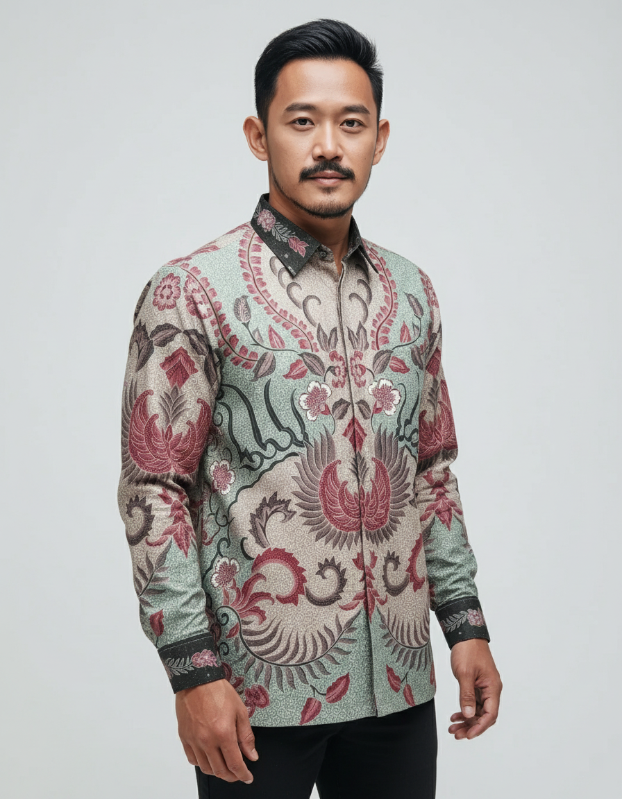 Goresannya kami tuangkan di atas kain katun primissima yang halus dan sejuk, memastikan setiap sentuhannya terasa nyaman di kulit. Warna hijau yang teduh menjadi latar, memberi ruang bagi detail merah dan sogan untuk bercerita dengan hangat.