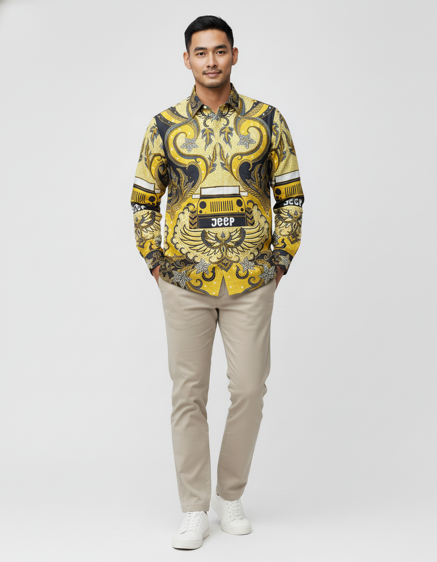 Kami menamai motif ini “Kembara Kencana”, yang berarti Pengembaraan Emas. Sosok kendaraan gagah di tengahnya adalah simbol dari langkah kita di dunia modern—sebuah penjelajahan yang penuh semangat dan tantangan. Namun, ia tak berdiri sendiri. Ia dipeluk oleh sepasang sayap megah, lambang dari cita-cita, perlindungan, dan warisan luhur yang selalu menjaga.