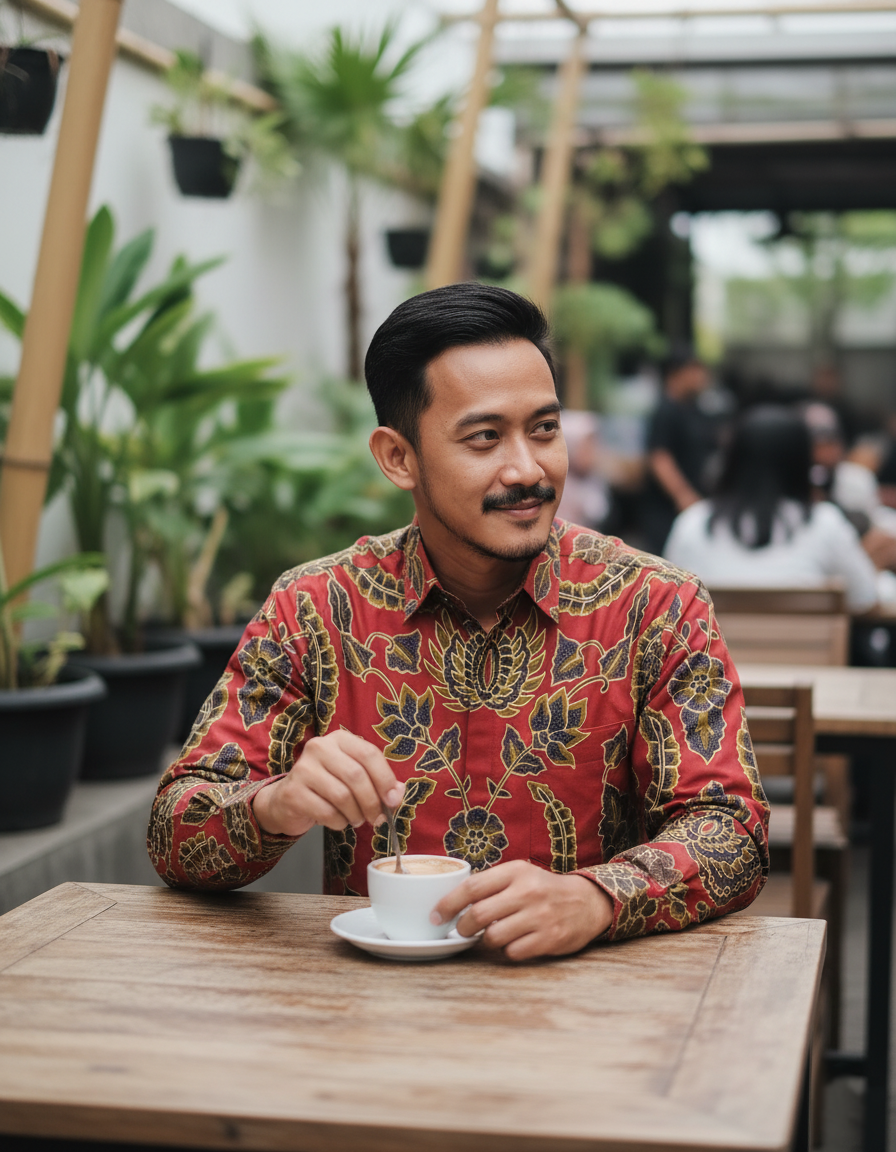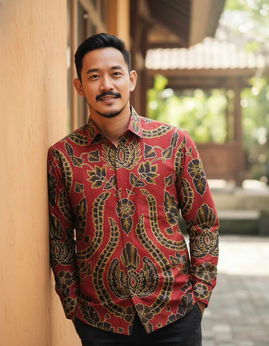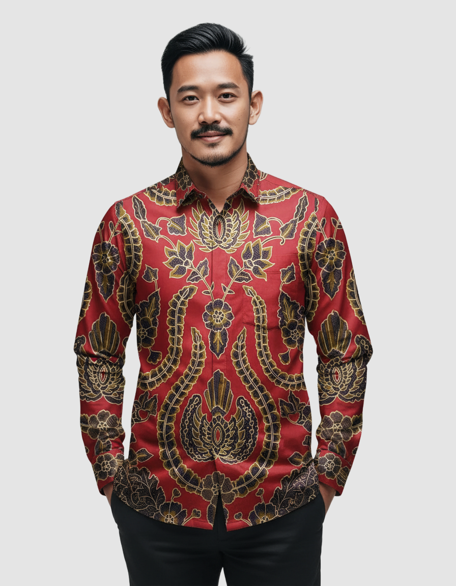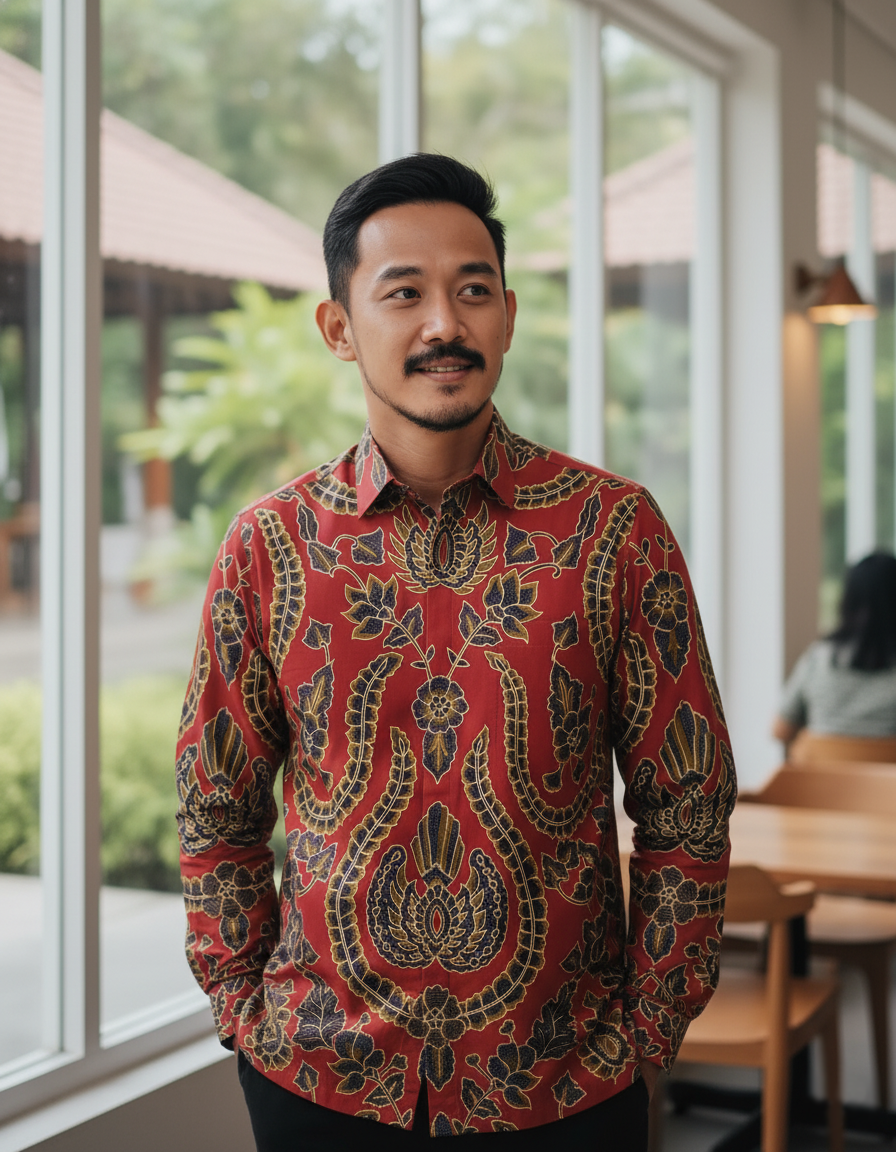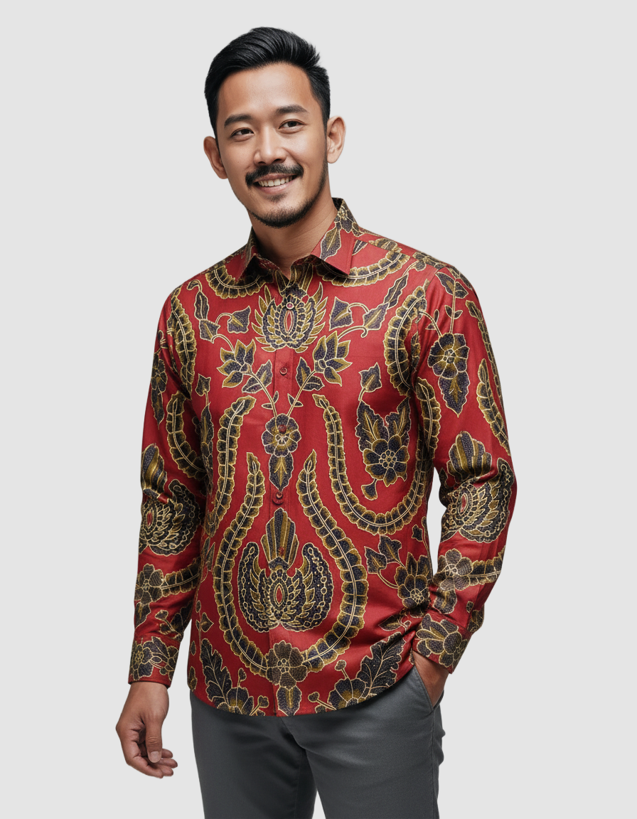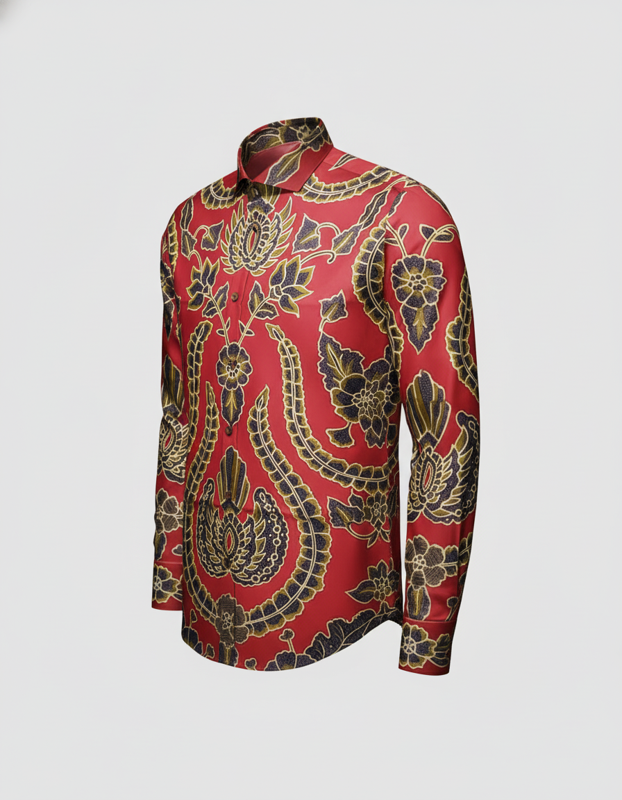 Setiap detailnya kami torehkan dengan teliti di atas kain katun primissima yang sejuk, memadukan warna merah yang memberi energi dengan sentuhan sogan dan hitam yang meneduhkan. Ini adalah harmoni antara semangat dan kedewasaan.