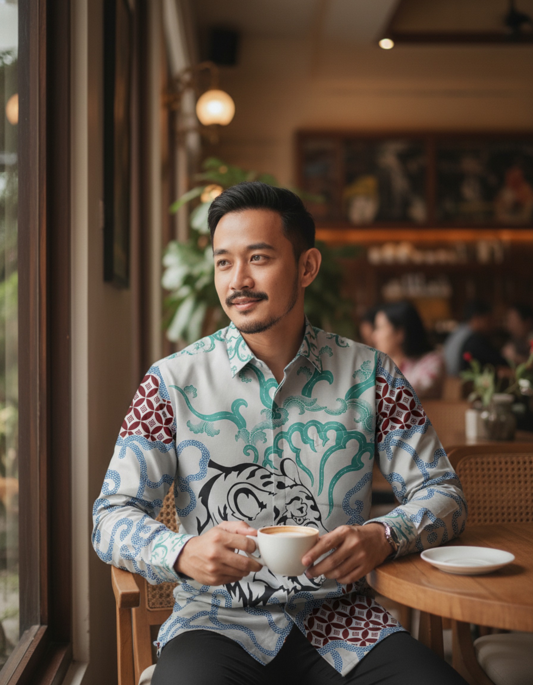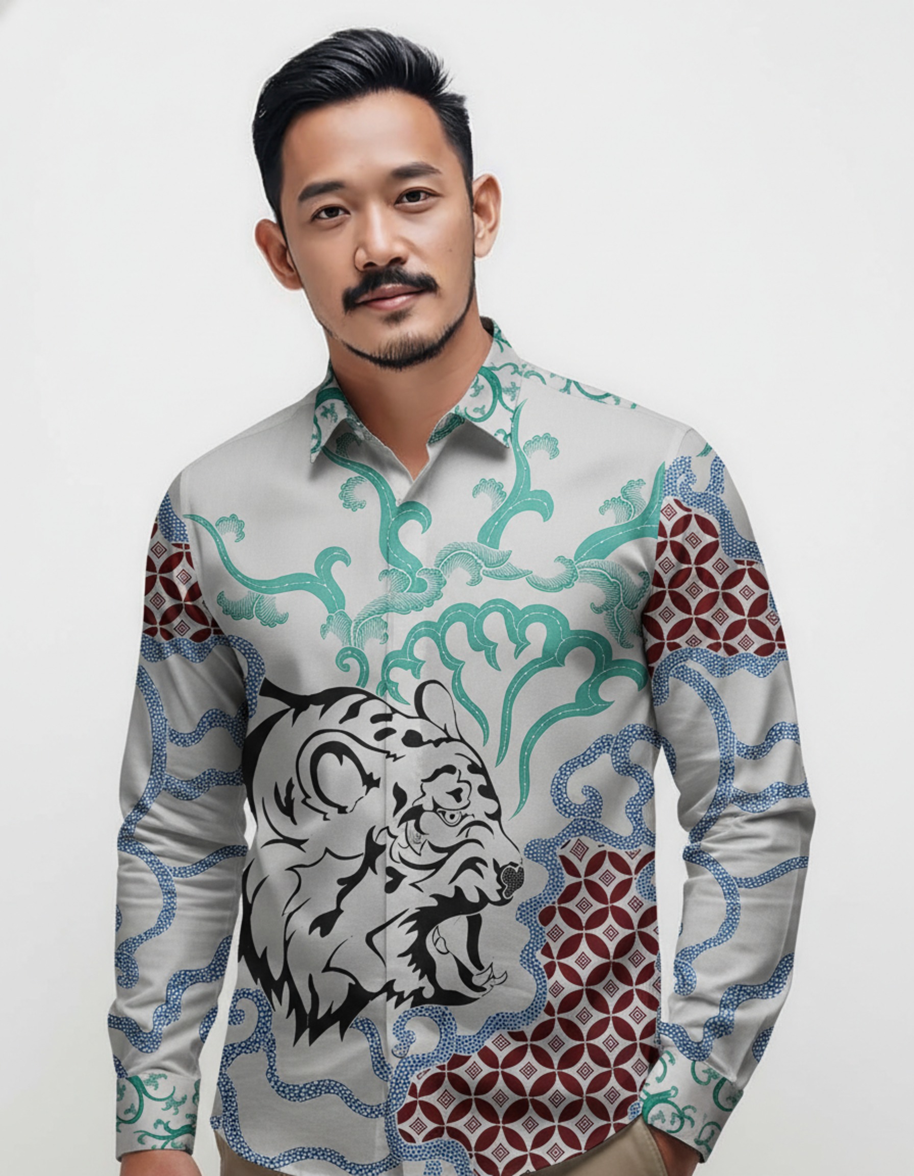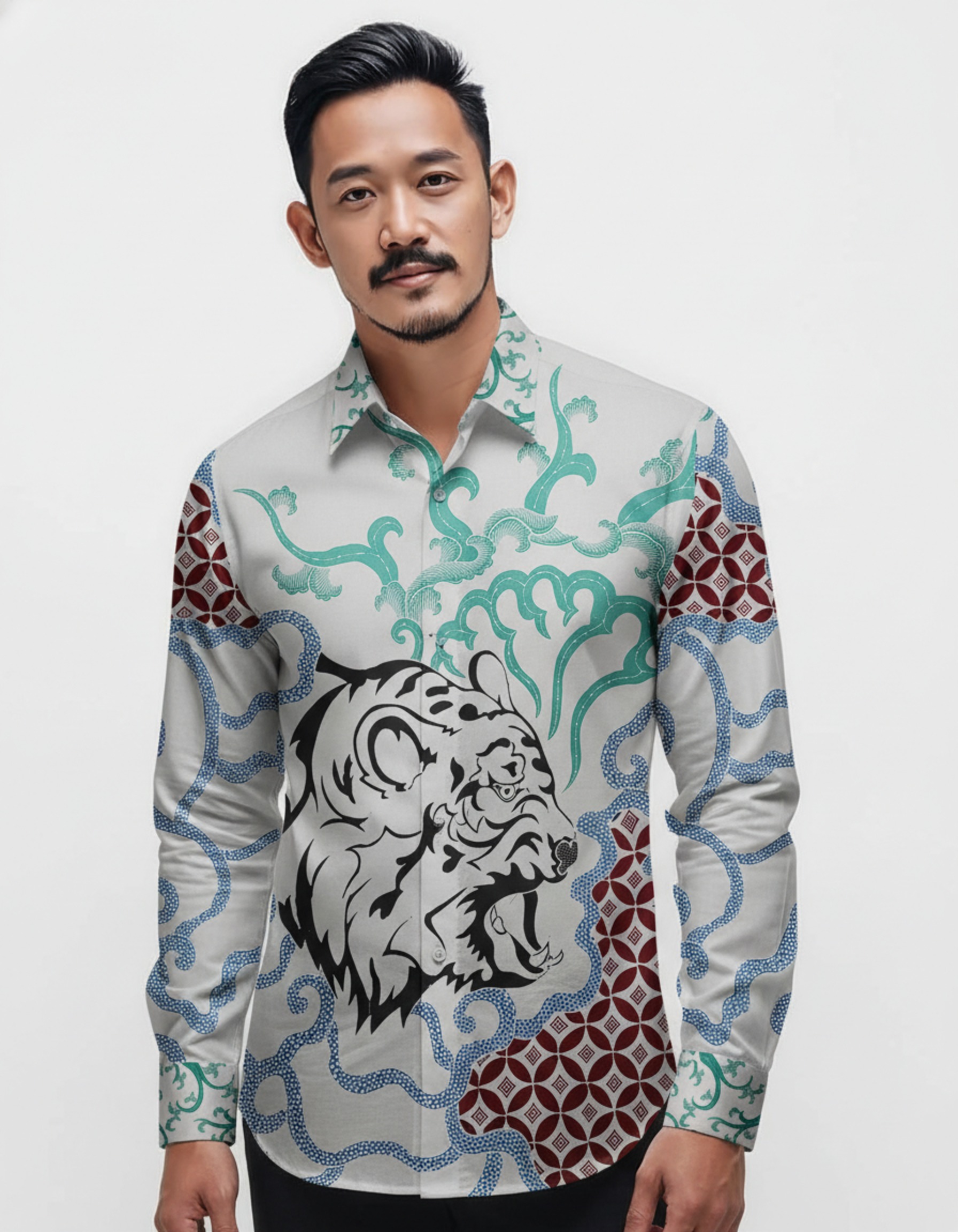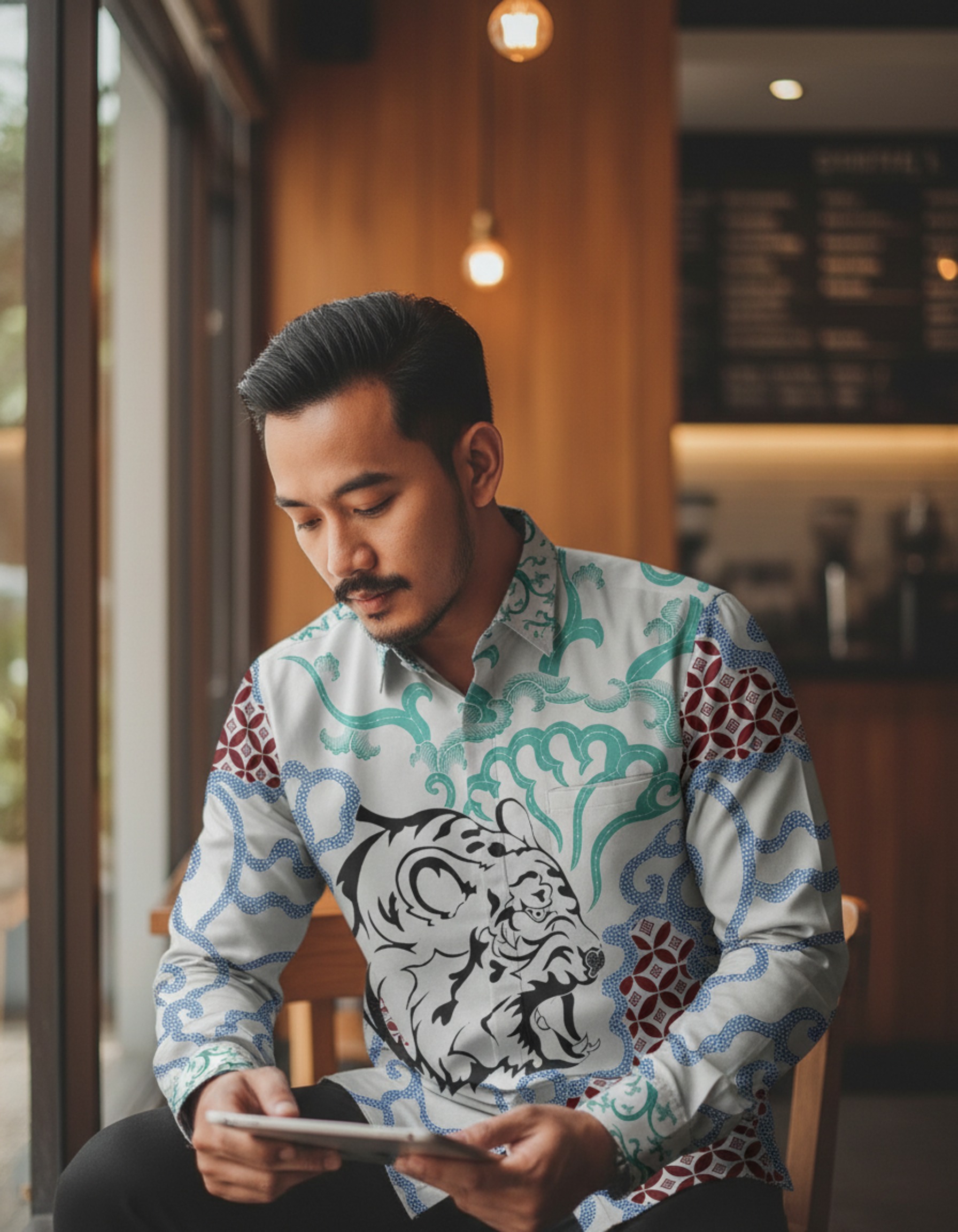 Sebuah perwujudan ketenangan dan wibawa dalam goresan motif macan yang gagah di atas dasar kain berwarna putih yang menenangkan. Dirancang untuk menemani setiap langkah Anda dengan kekuatan yang teduh.