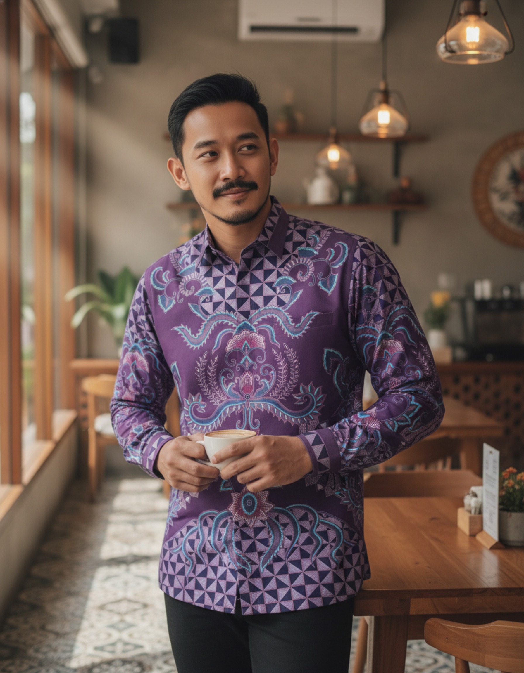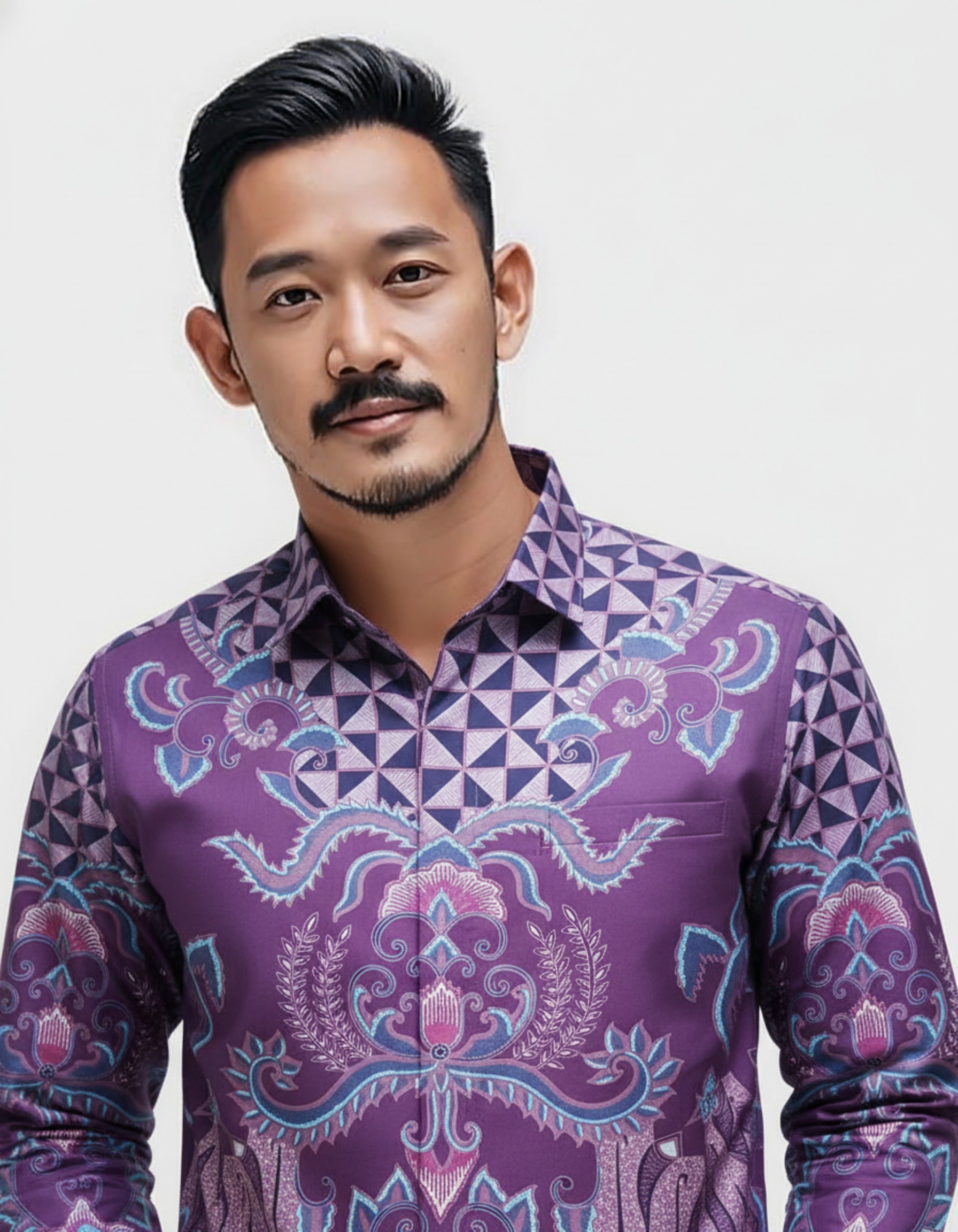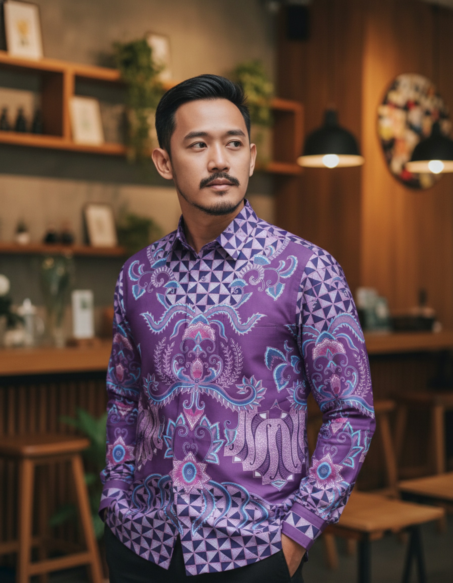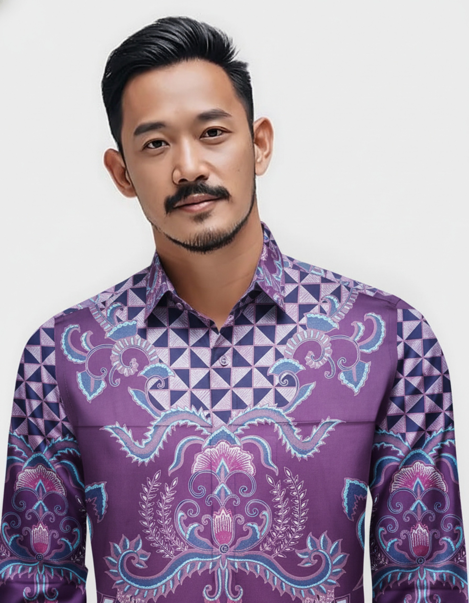 Perpaduan warna ungu yang dalam dengan sentuhan biru teduh menciptakan harmoni visual yang menenangkan sekaligus berwibawa. Di atas kain Katun Primissima yang halus, setiap detail terasa hidup, menjadikannya lebih dari sekadar pakaian, tapi juga sebuah cerita yang melekat di badan.