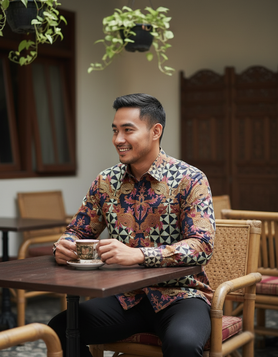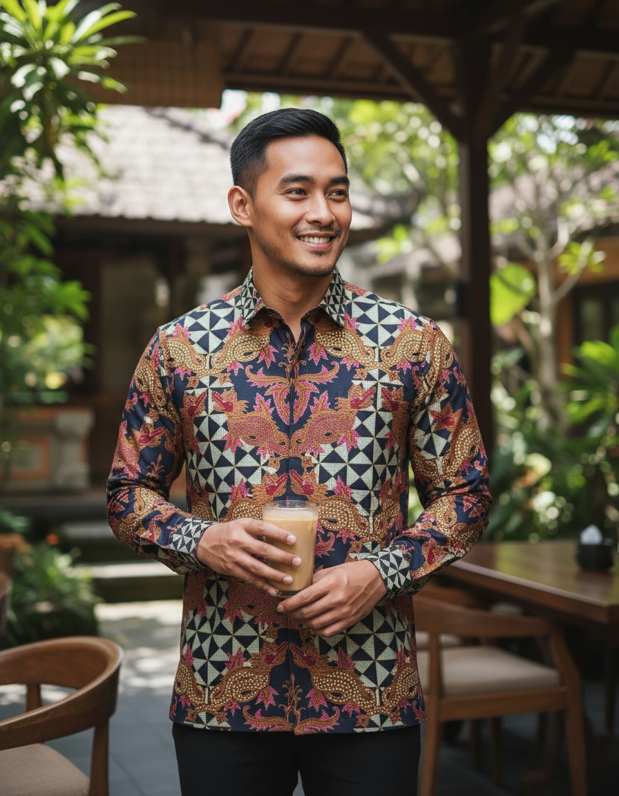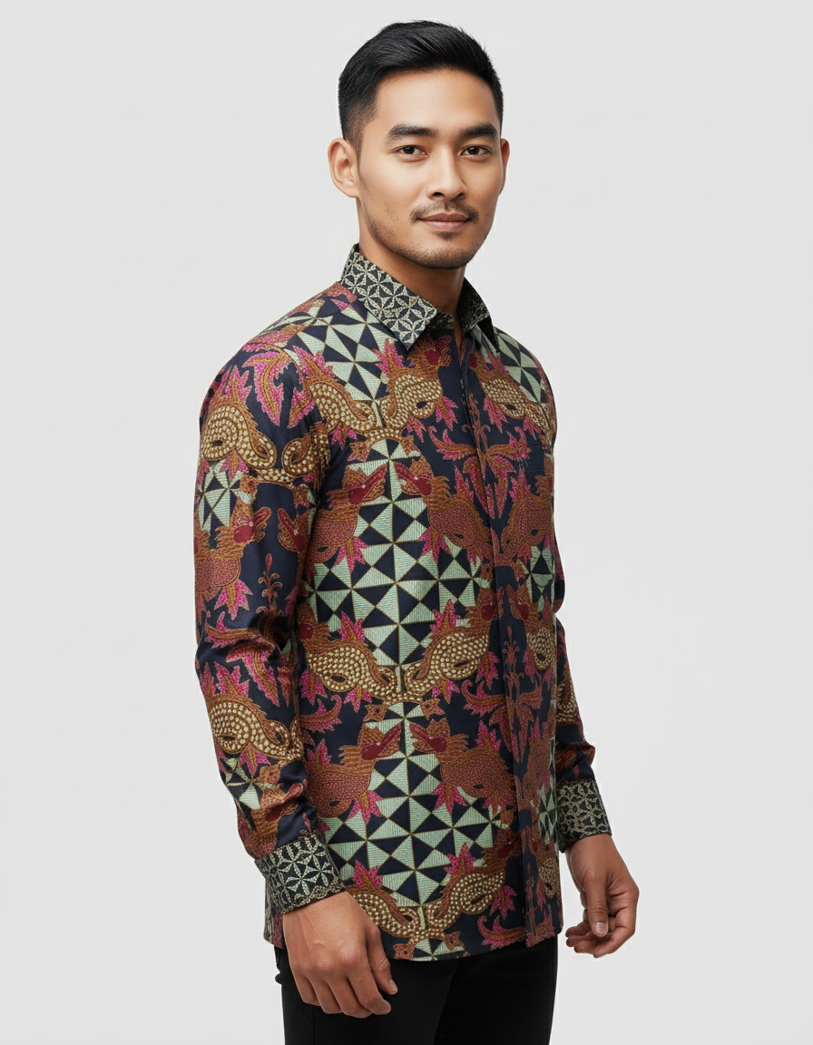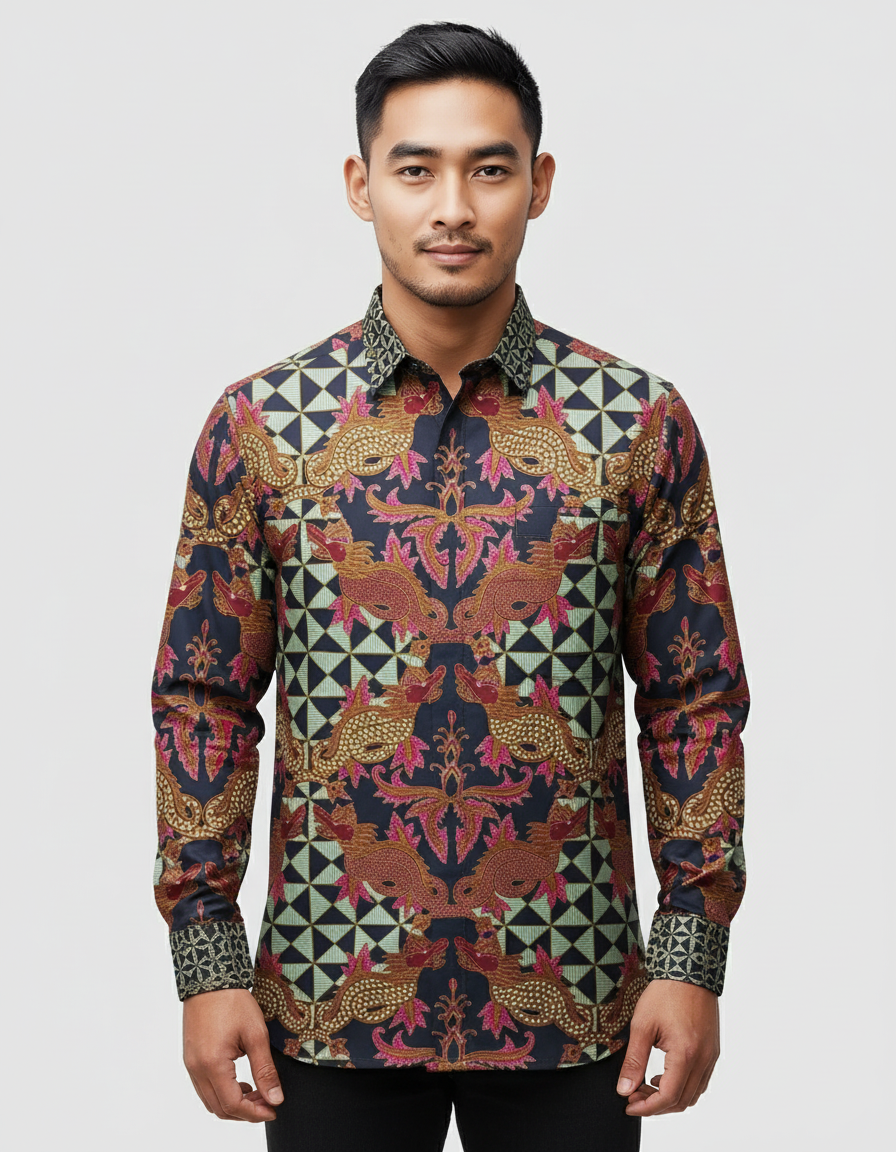 Goresan sogan, merah, dan sentuhan merah muda memberi nyawa pada sang naga, sementara latar hitam pekat memberinya panggung untuk bersinar. Semua ini kami tuangkan di atas helai katun primissima yang sejuk dan nyaman, memastikan wibawanya tetap terasa ringan saat dikenakan.