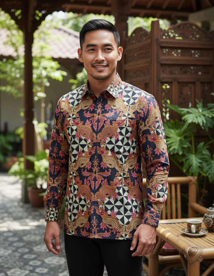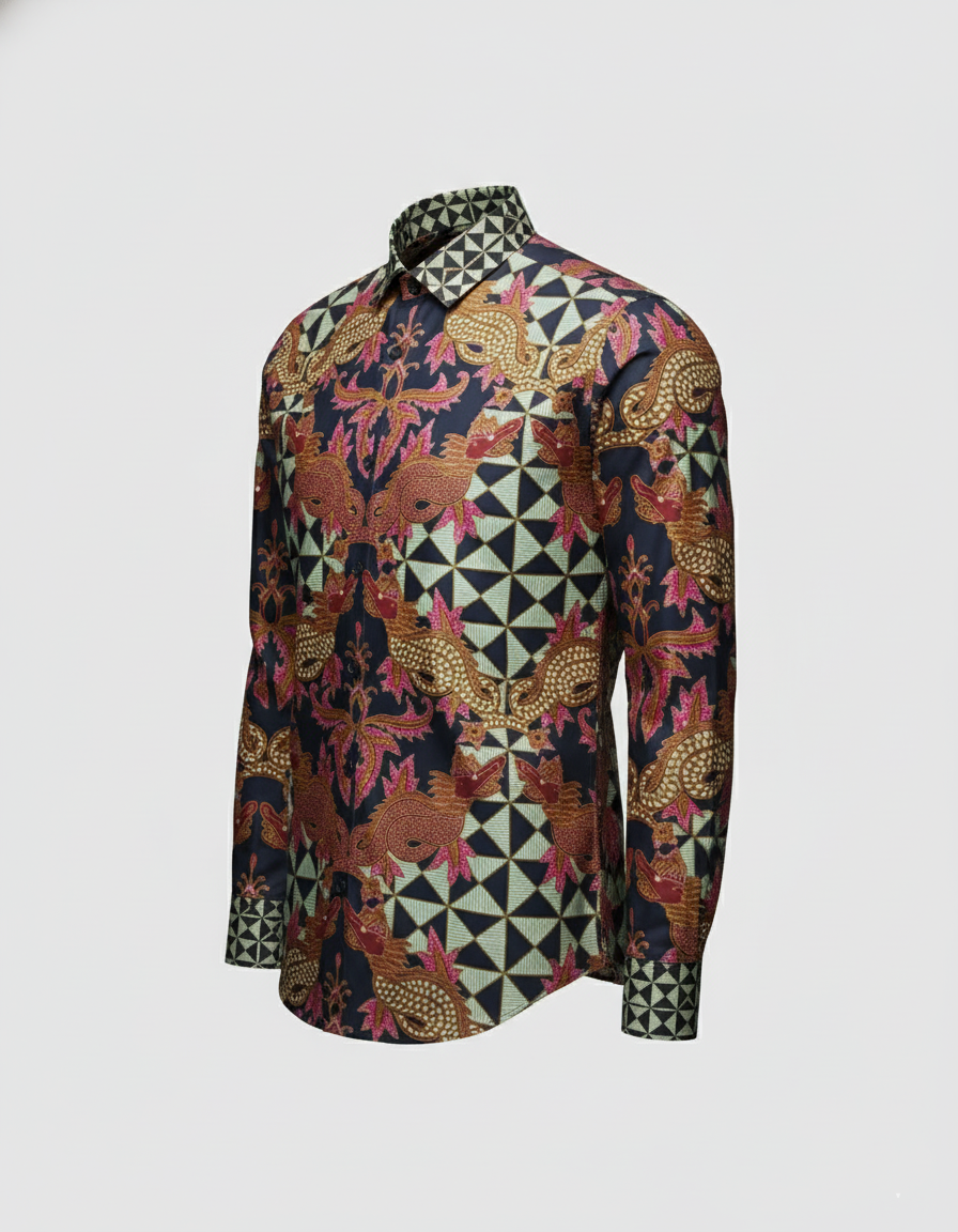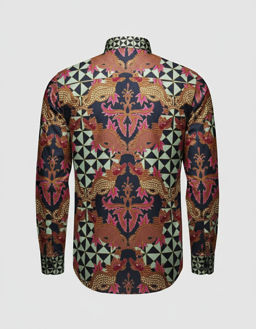 Kami melihat motif Naga sebagai simbol penjaga, pembawa kemakmuran, dan kekuatan yang bijaksana. Ia tidak berdiri sendiri, melainkan bersemayam di dalam sebuah “mandala”—latar geometris yang melambangkan keteraturan dan keseimbangan alam semesta. Perpaduan keduanya adalah harapan tentang kekuatan yang digunakan untuk menjaga harmoni.