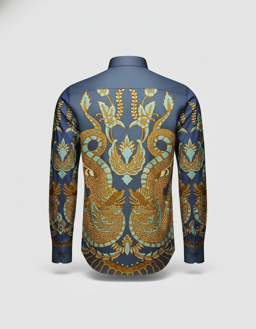 Warna biru keabuannya kami pilih untuk melambangkan ketenangan langit sore, sementara sentuhan sogan keemasan adalah percik harapan dan kemuliaan. Setiap titik isen-isen yang mengisi tubuh sang naga adalah doa yang kami rapalkan satu per satu di atas kain katun primissima yang sejuk.