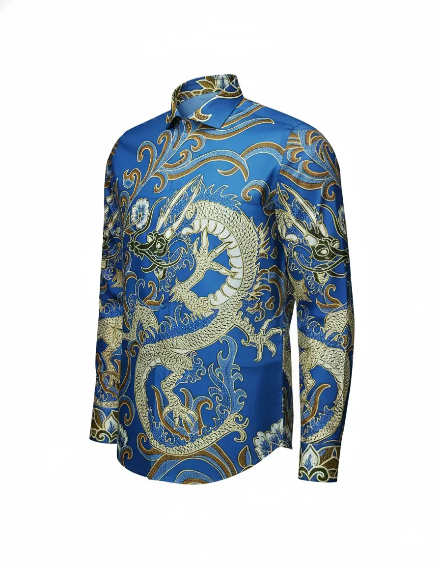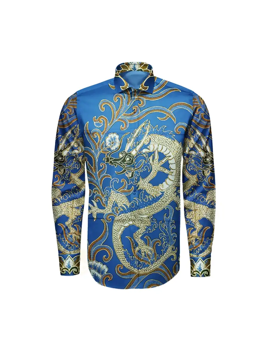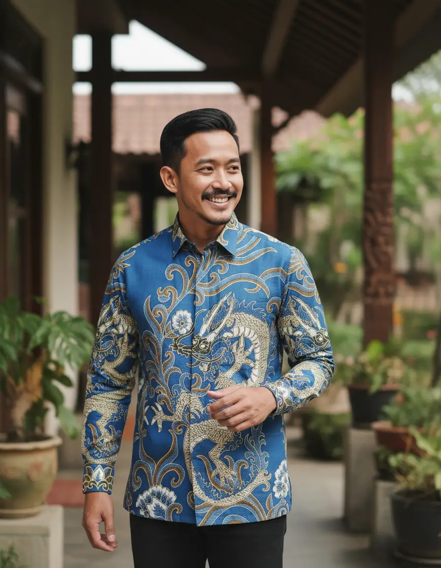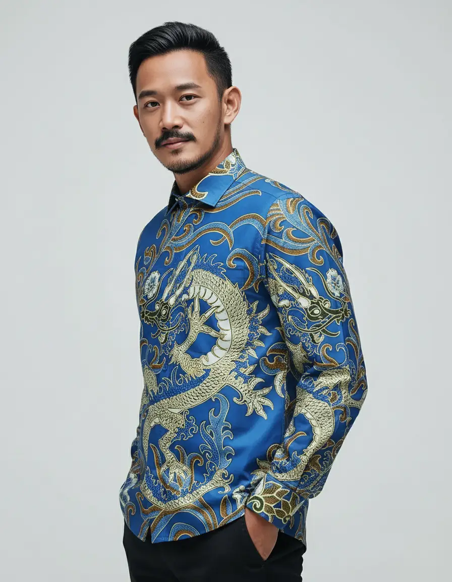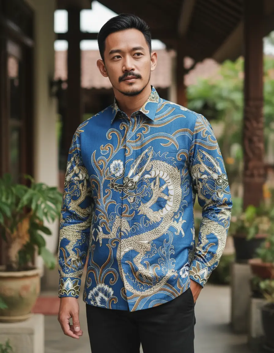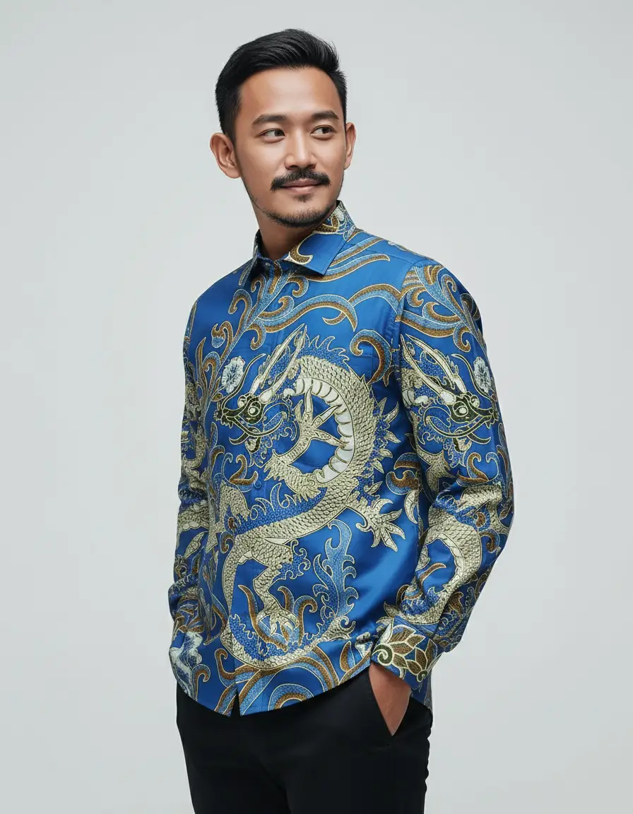 Kami membayangkan naga bukan sebagai makhluk yang menakutkan, melainkan sebagai penjaga samudra yang bijaksana. Ia meliuk anggun di antara sulur dan bunga, sebuah simbol bahwa kekuatan sejati selalu hadir berdampingan dengan keindahan dan kelembutan. Detail emasnya adalah percikan cahaya yang memantul dari permukaan air, lambang harapan dan kemakmuran.