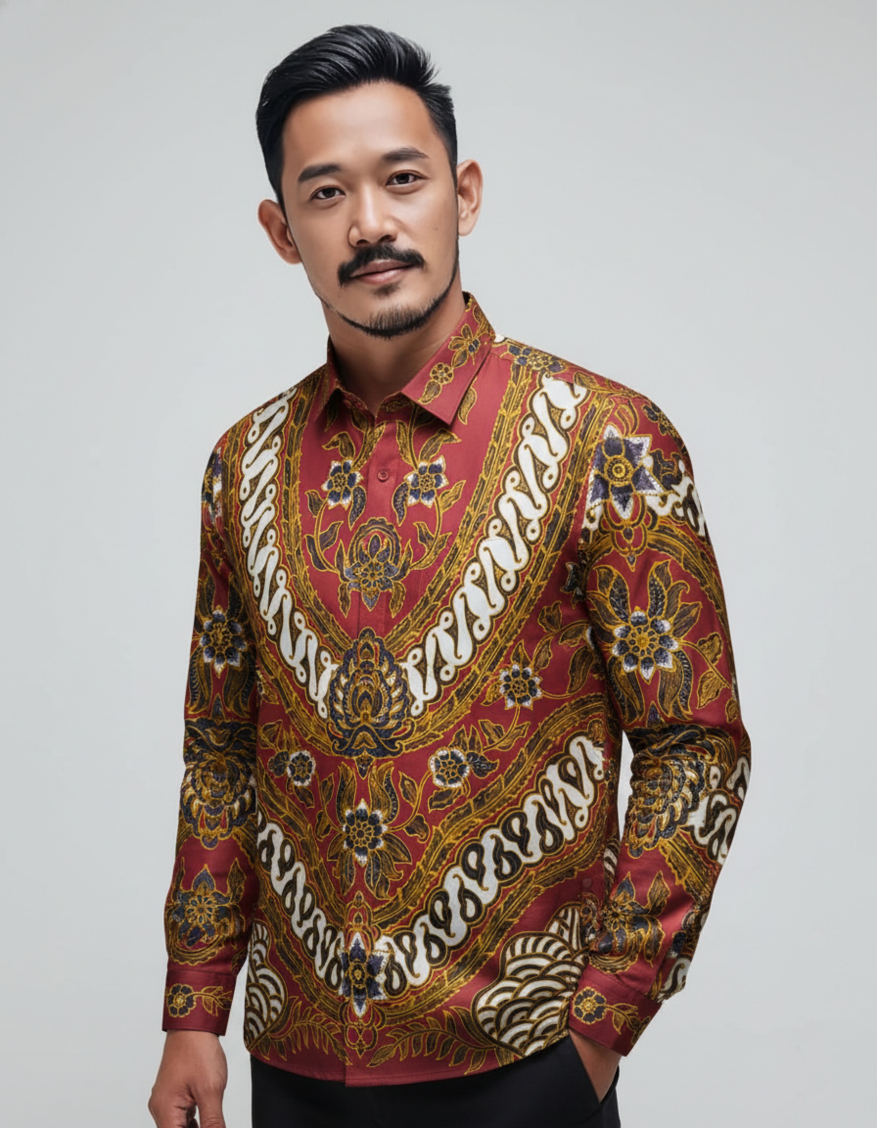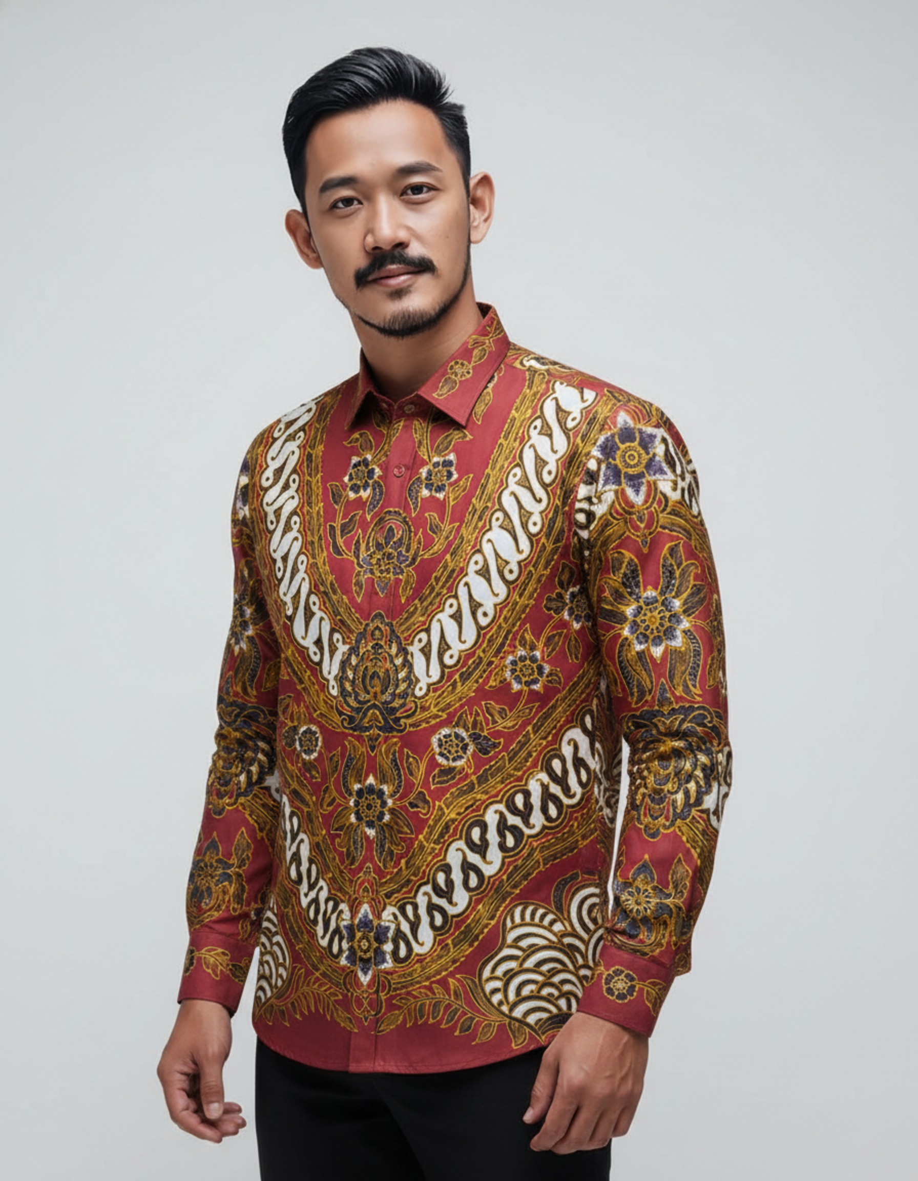 Tergores di atas kain katun primissima pilihan yang terasa sejuk dan halus di kulit, setiap detailnya dikerjakan dengan penuh ketekunan. Warna merahnya yang matang berpadu dengan aksen sogan dan emas, menciptakan harmoni visual yang anggun tanpa berlebihan.