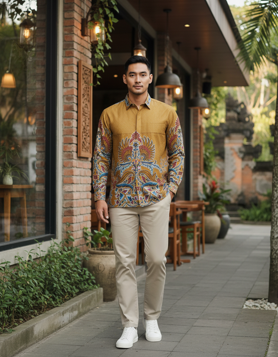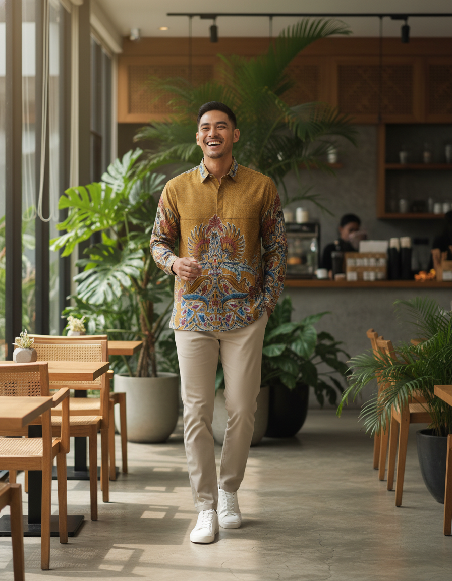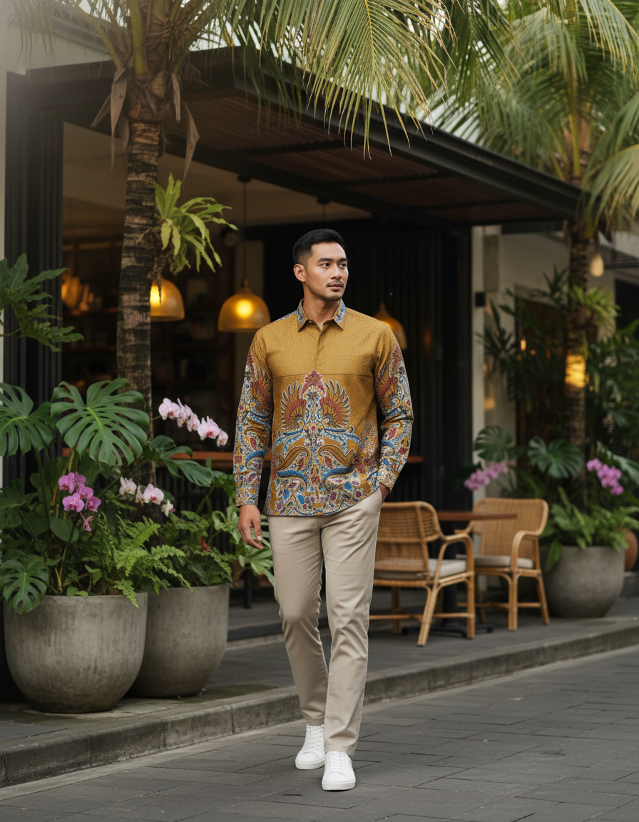Dalam balutan warna emas yang hangat, motif Paksi Kencana membentangkan sayapnya, membawa harapan dan kemegahan. Sebuah karya untuk menemani setiap pencapaian dengan keanggunan yang membumi.