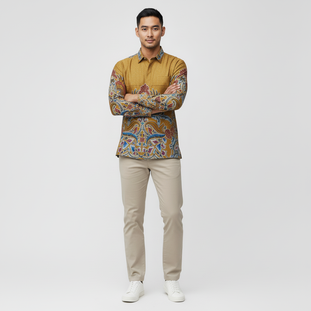 Cerita ini kami tuangkan di atas kain katun primissima pilihan, yang terasa sejuk dan nyaman di kulit, membiarkan Anda bergerak leluasa sepanjang hari. Warna emasnya yang teduh dipadukan dengan aksen biru dan merah untuk memberi sentuhan energi yang seimbang.