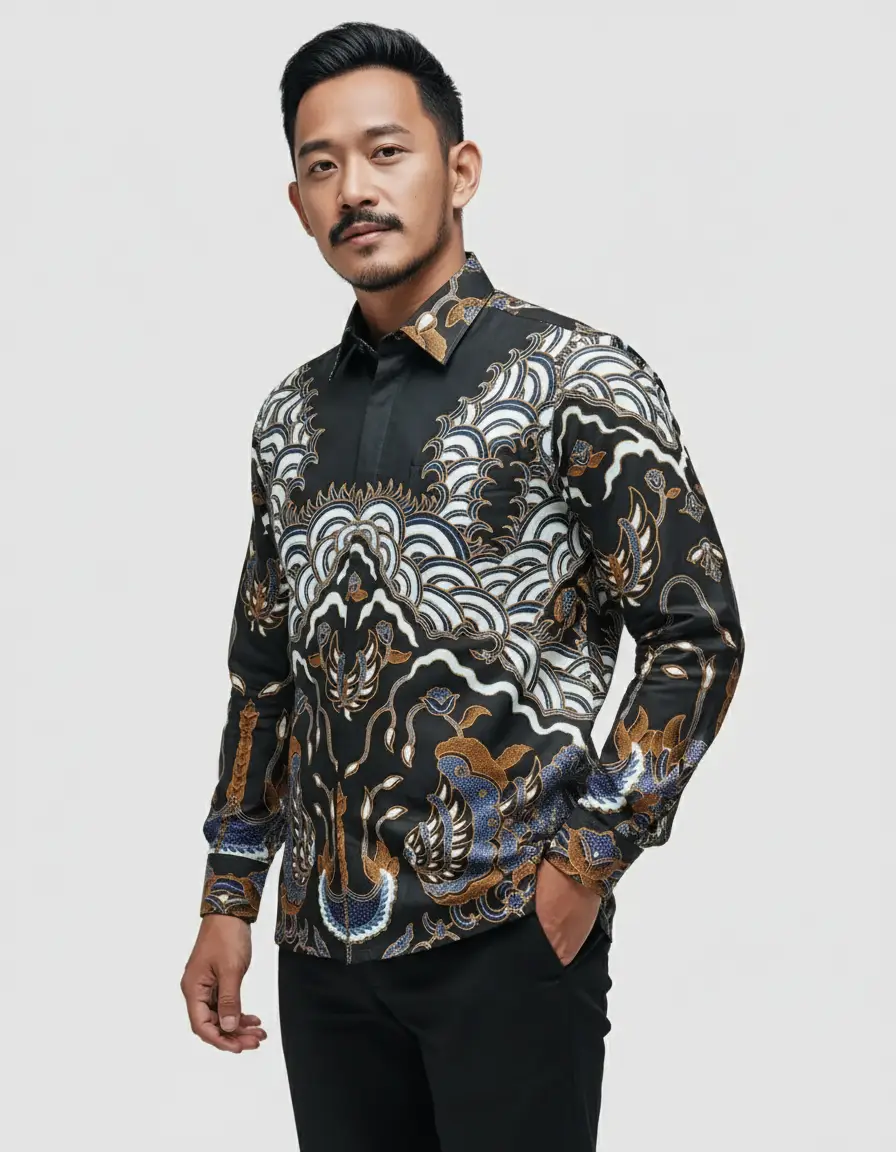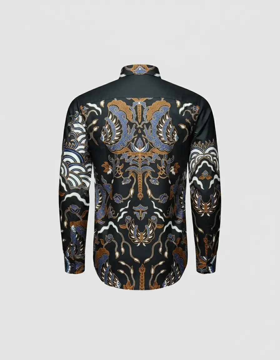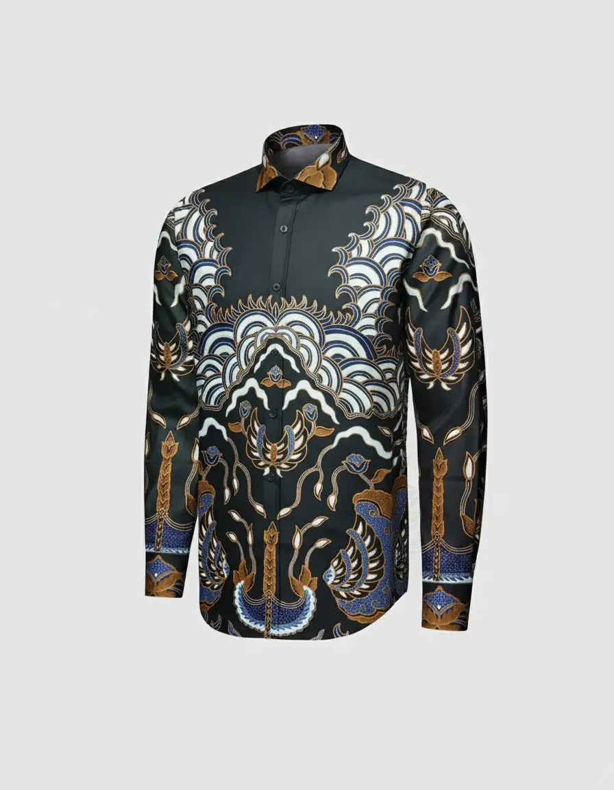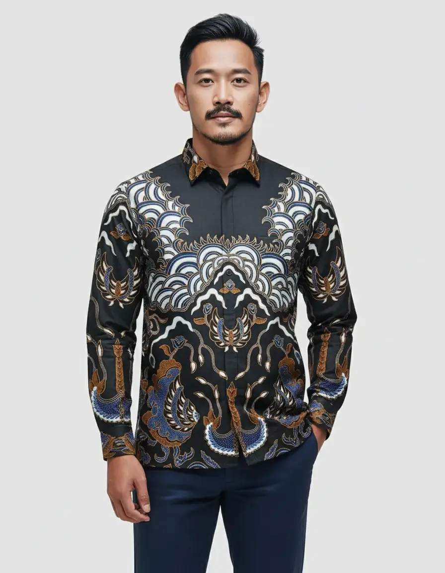 Bagi kami, motif ini adalah simbol pusaka dari langit: sepasang sayap yang melambangkan harapan dan perlindungan, serta inti yang kokoh di tengahnya sebagai pengingat akan jati diri. Ia adalah penjaga yang tenang, dibalut warna hitam sebagai simbol kedalaman, biru untuk ketenangan, dan sogan sebagai lambang kemakmuran yang membumi.