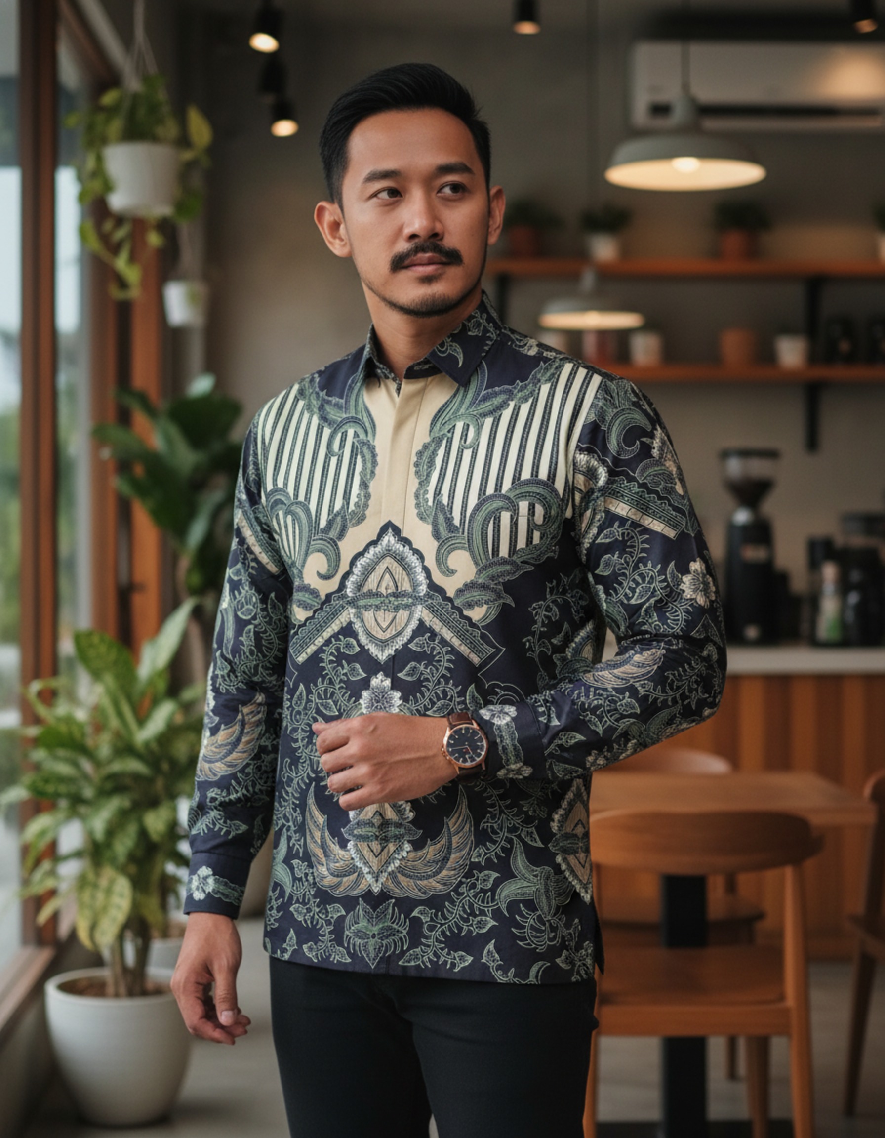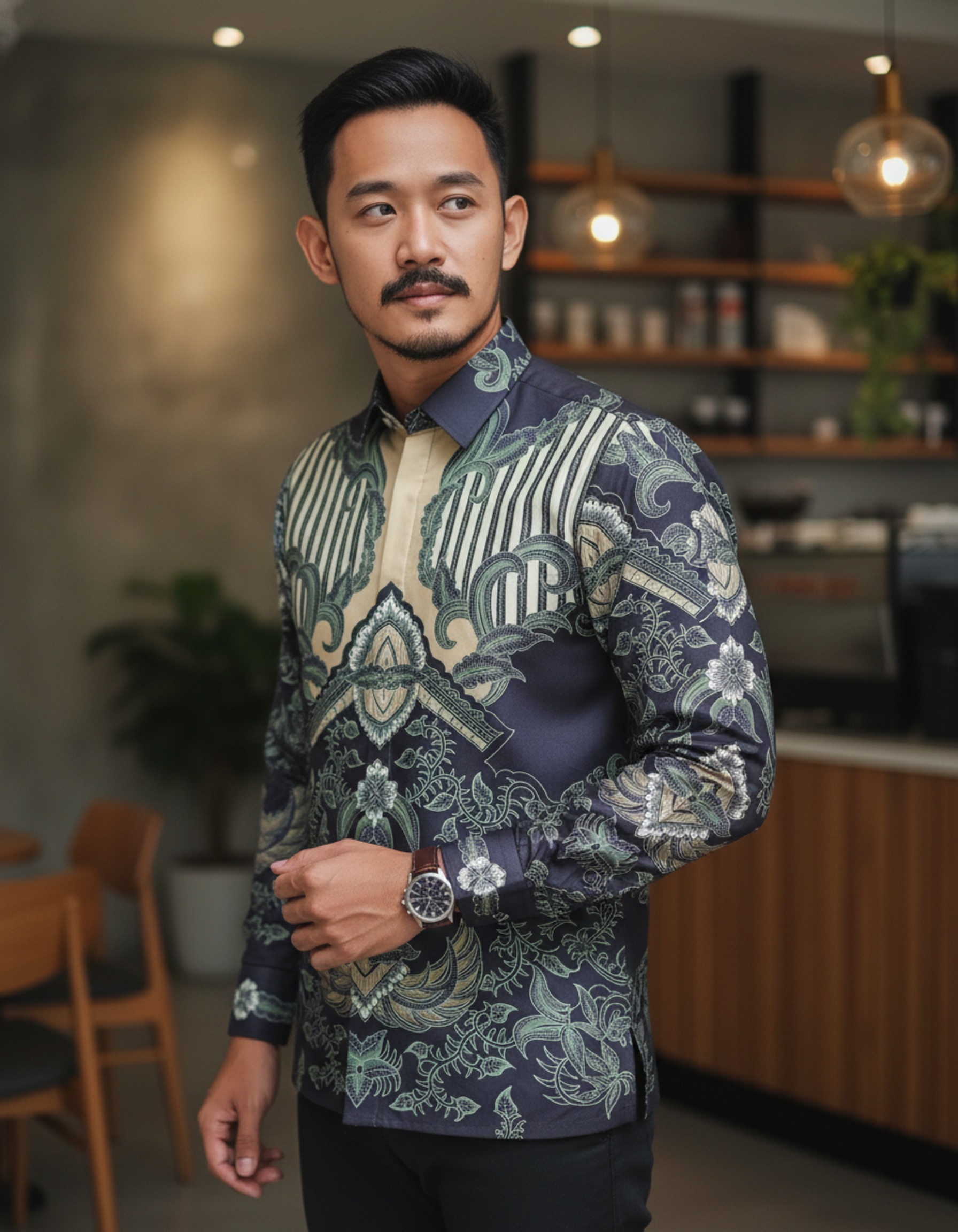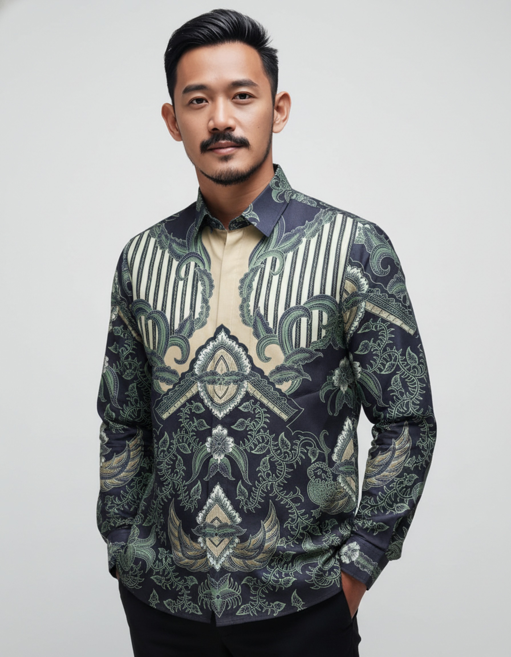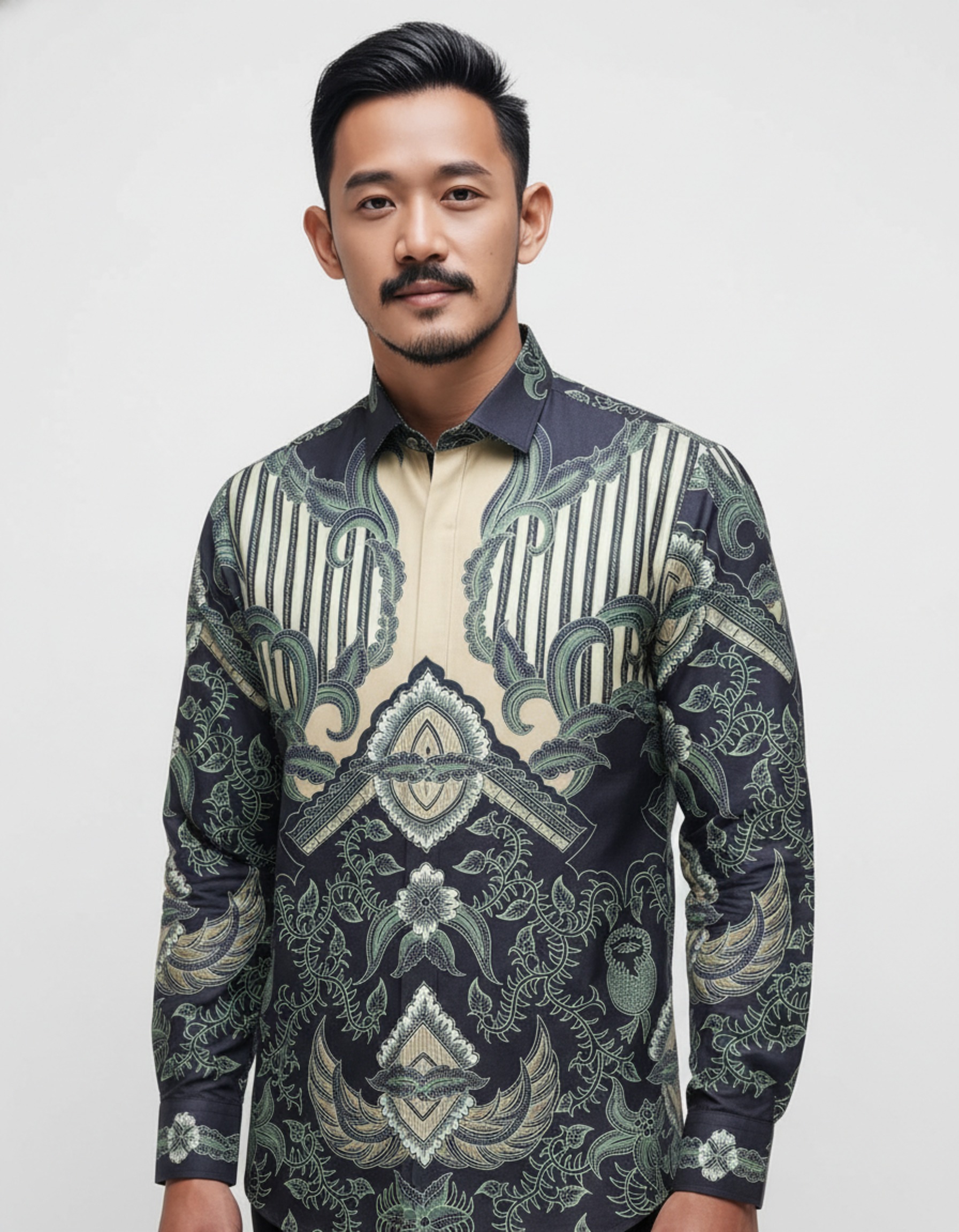 Garis-garis tegas yang berpadu dengan sulur lembut adalah cerminan dari pemimpin yang bijaksana—ia yang memiliki ketegasan namun tetap merangkul dengan kelembutan. Warna hitamnya melambangkan kedalaman, sementara sentuhan hijau dan krem menjadi pengingat bahwa di dalam setiap ketenangan, selalu ada kehidupan dan harapan yang tumbuh.